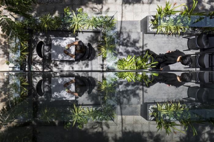 整个项目看起来像一个面向周边环境开放的透明体块。它增强了周边商业区位的吸引力和商业共鸣,并与周边的其他业态形成了共生关系,从而成为了该区域一系列贸易活动的核心。项目有助于相邻界限的恢复,扩大了城市后退空间。在建筑物的周边和外部种植的树木形成了缓冲廊道,减少了阳光对两个玻璃墙系统的影响。玻璃墙受到较少的阳光照射,多个滑动门被设置在不同的方向,以最快地散出玻璃的热量,增强室内建筑空间的通风,由此缓解了建筑的温室效应。