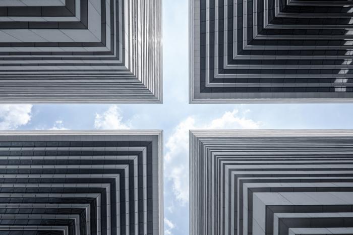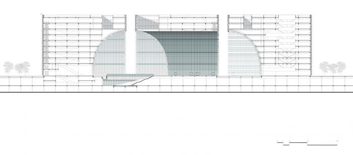 立面设计遵循多样统一性的原则。白色花岗岩营造出厚重坚实的方正外形,轻盈通透的弧形玻璃幕墙则跳脱而出,两者结合刻画出边界切割的线条感,增强抽象体块的立体感。具有明显材质区分的内外侧立面均设有统一的横向构件,沿用弧线悬挑结构的几何思路。同时,这些由花岗岩或铝材制成的构件也形成了整个建筑的外遮阳系统,有效节省能耗。