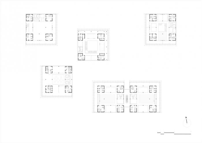 常州文化广场融入四周的公共景观,与北侧的常州大剧院遥相呼应,共同刻画常州城市中心的崭新形象。这座巨大的建筑综合体由六个相互独立的模块单元旋转组合,构成一组2×3的网格秩序。每个单元模块拥有70米见方的基本平面,以自成体系的形式运作,分别提供美术馆、图书馆、酒店、办公空间其中一种功能用途,各自通过独立的主入口及门厅与外部联系。