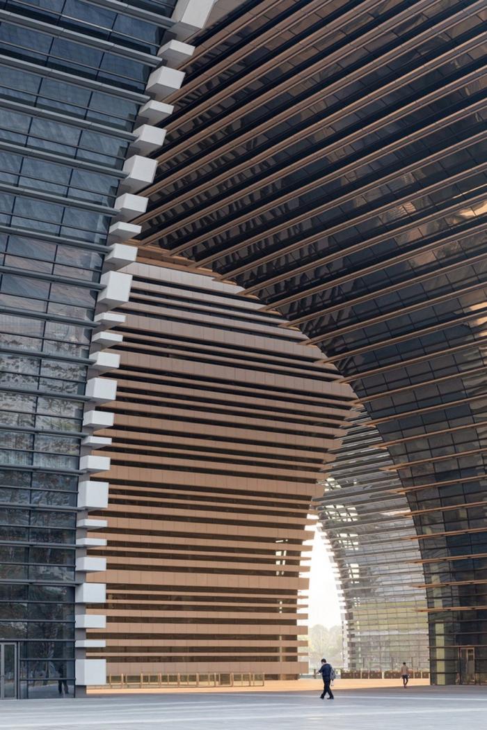 同时,峡谷河流的生动景致强化了建筑拱桥般的形象,也将文化广场连接至场地东南侧的地铁站。建筑北立面呈现开放迎接的大门姿态,与位处龙城大道主路一侧毗邻市民广场的常州市政府和大剧院建筑,构筑和谐的轴线关系。