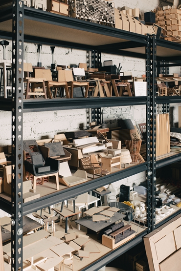 软木板覆盖周围的墙壁,以显示正在进行的项目,并帮助吸收声音。货架展示模型和设计,包括家具概念,以及木材、金属和石头样品等材料测试。