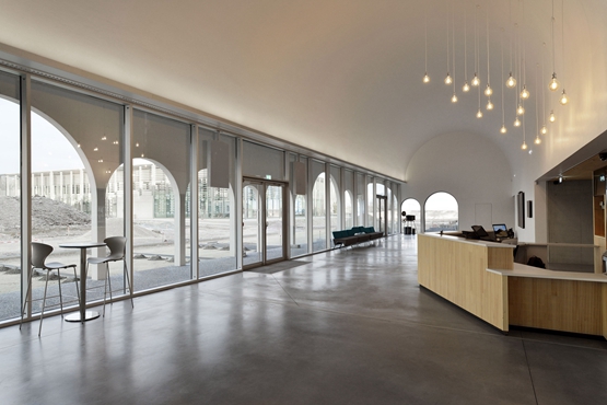 柱廊的一边是一个巨大的筒形拱顶形接待大厅,通向三个电影院的屏幕和一个会议室。