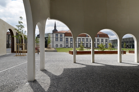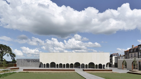 法国设计工作室“轨道建筑事务所”(Tracks Architectes)在法国中部里奥姆镇(Riom)的一座前修道院的庭院里建造了一座电影院,电影院前面有一个不规则的拱形柱廊。