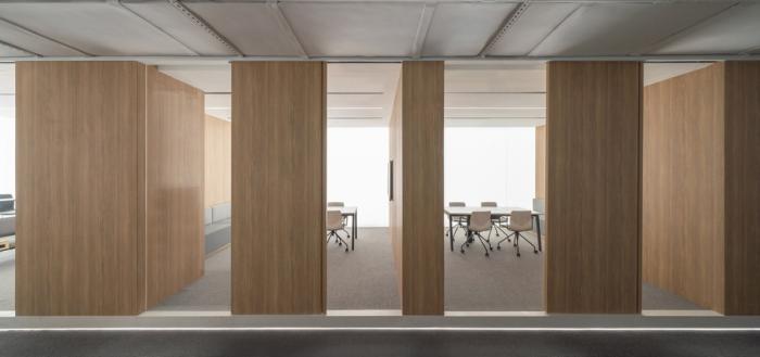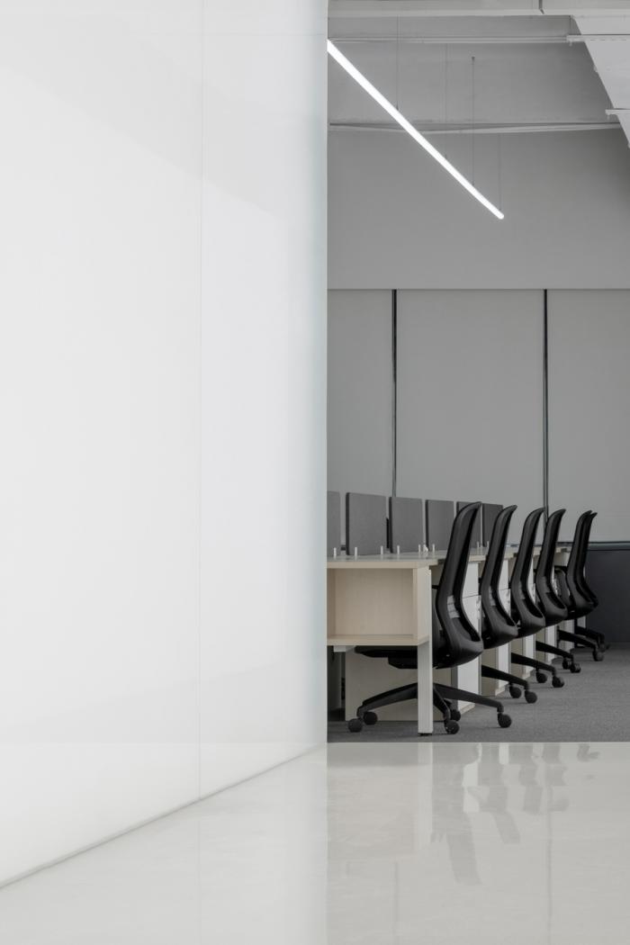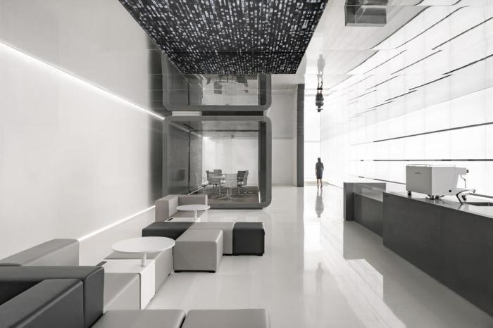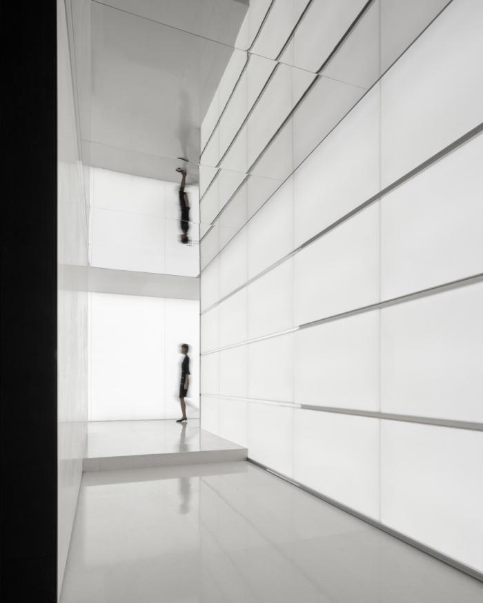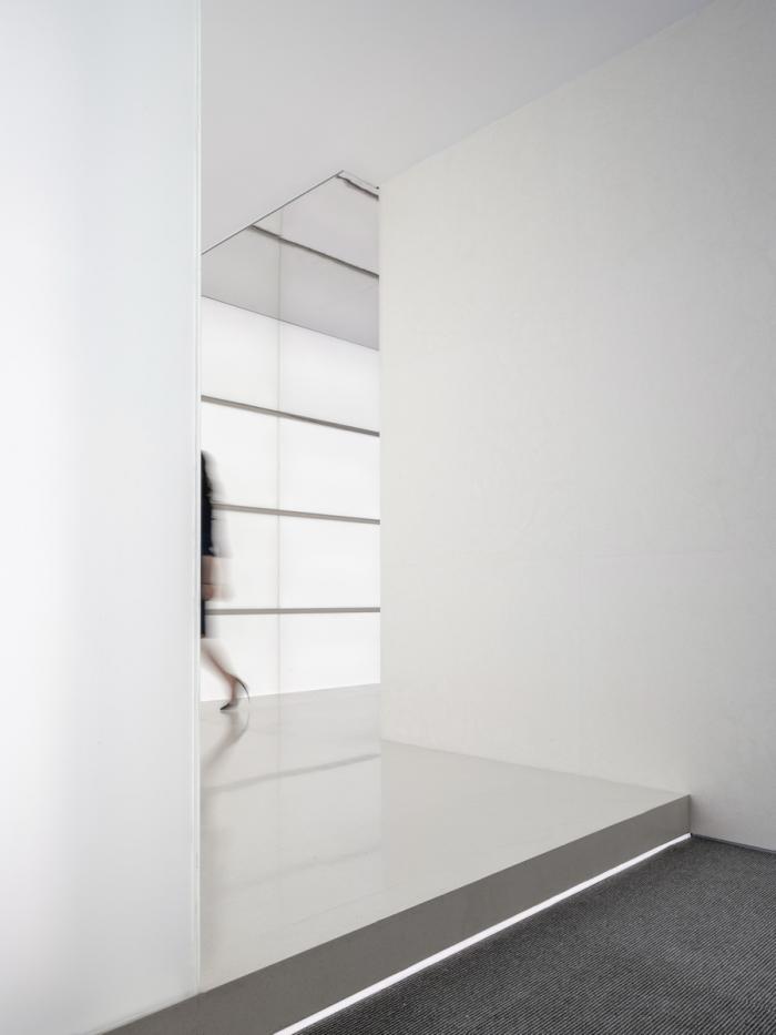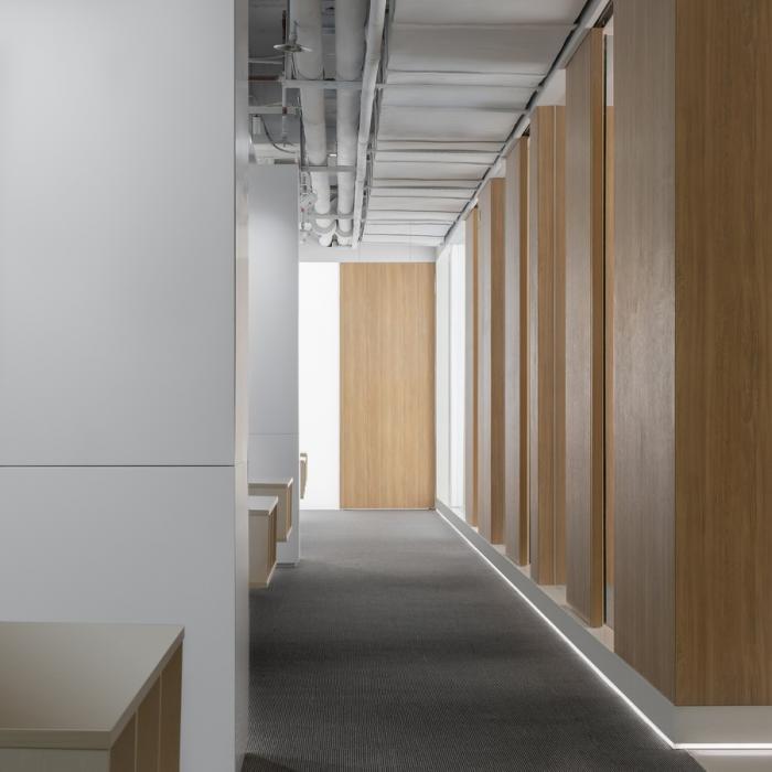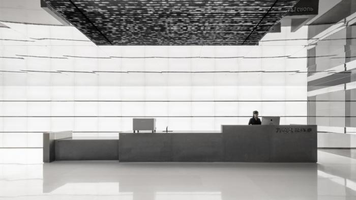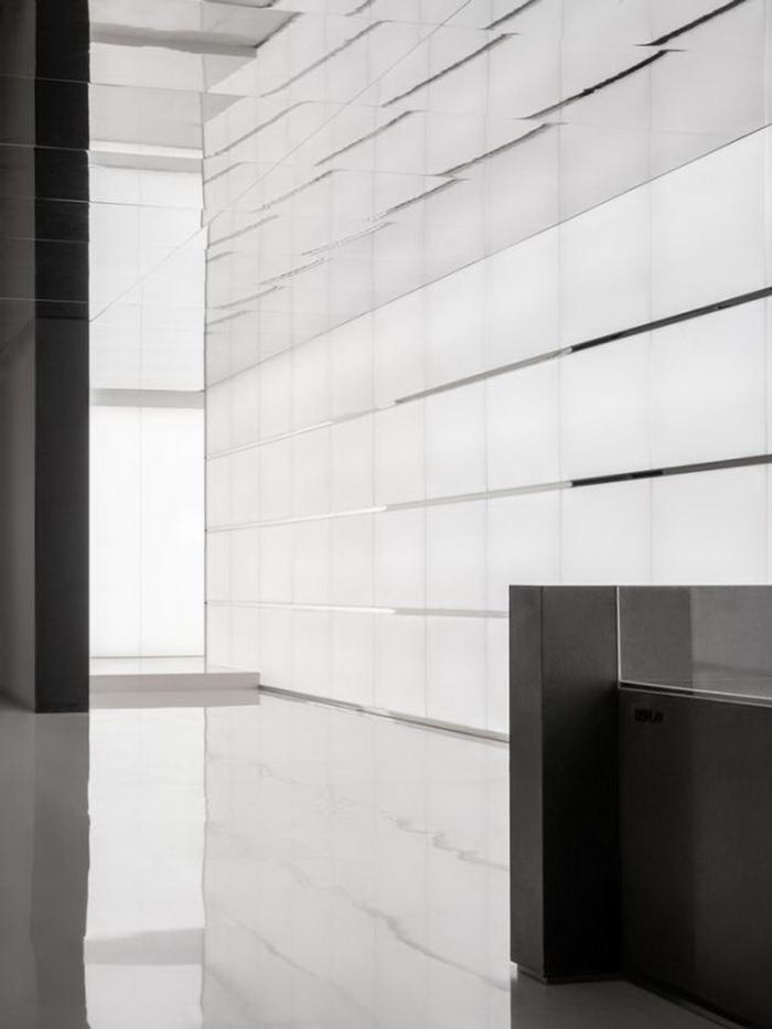 秩序与自由、理智与文明,在大堂通往办公区的通道中运用材质与氛围光的结合,仿佛营造出另一个精神世界。