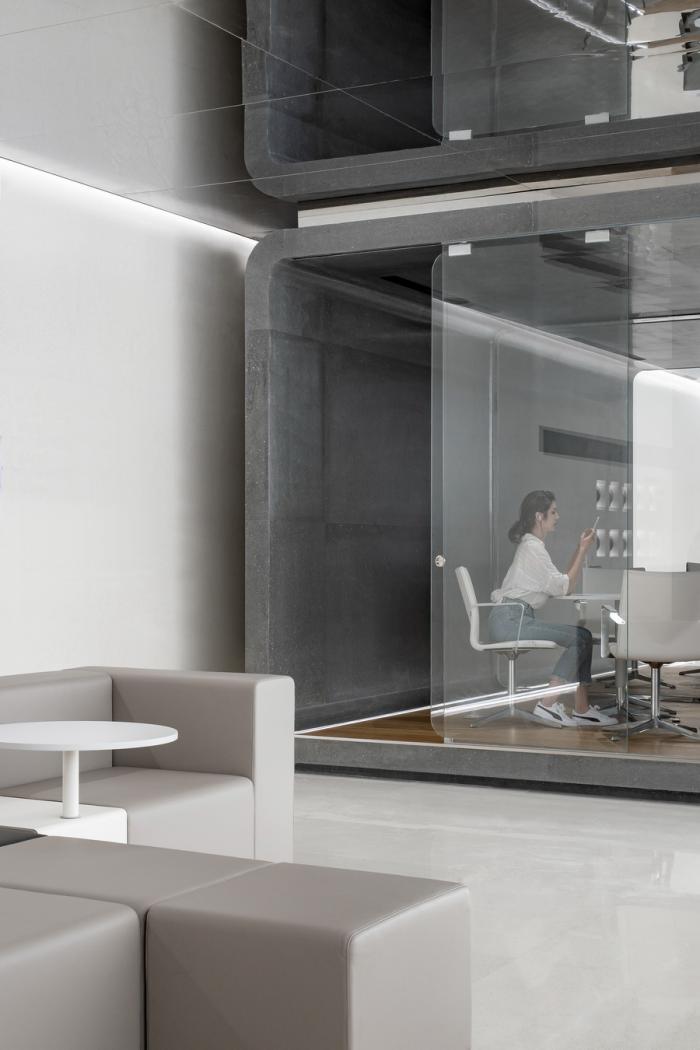 会议接待室以舱体胶囊概念置入在空间里,并结合多媒体影像输出。