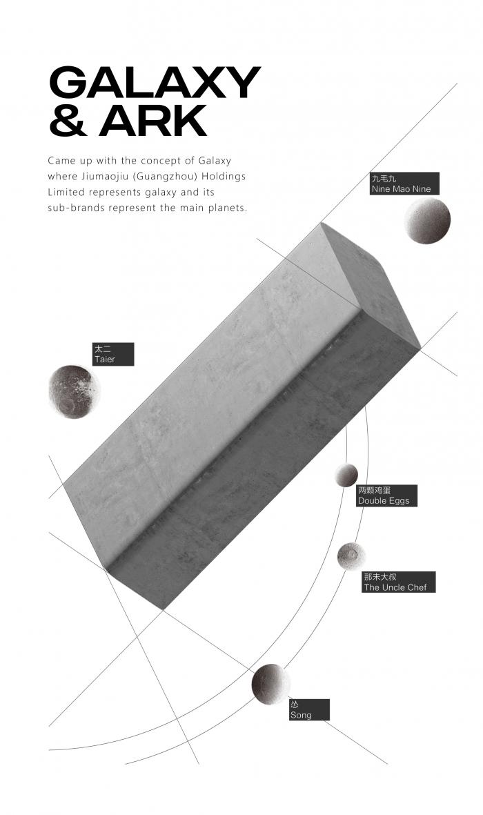 九毛九集团,品牌由旗下各大餐饮子品牌围绕而成。壹所输入星球概念,把九毛九集团比喻成一个星系,各大子品牌就是星系里主要星体。愿景打造属于九毛九的宇宙世界,在“九毛九星系”里,九毛九集团总部空间扮演的是一个“方舟”的角色,展厅内承载所有餐饮品牌星球的数据信息,期望参观者来到此空间可以犹如坐上宇宙方舟,穿梭在九毛九品牌星球之中,众览整个星系。