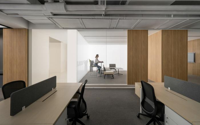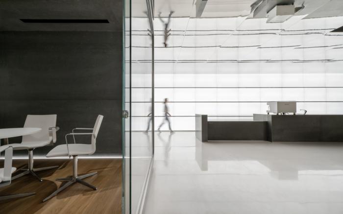 我们置入“玻璃盒子”作为会议室墙体隔断,盒子内部设置灯光,形成大面积的人工照明满足办公所需,也可作为书写的载体。