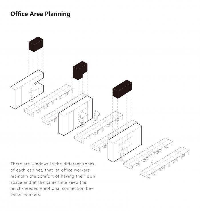 办公内部基本都是开放空间,需要容纳100+的卡位,我们在空间中置入三个柜体将卡位进行分割,柜体通过几何窗口令不同区域的工作者保持自身空间舒适度的同时也保持视线上的情感和需求连接,柜体用不同的几何形体开口形成不同的功能用途,如展示柜、卡座、吧台等。将“工作场所”转变成舒适的“生活空间”,我们希望能够给予空间更多的内部可塑性与可能性,毕竟,“星系”中还有很多“星球”等着九毛九去发现……