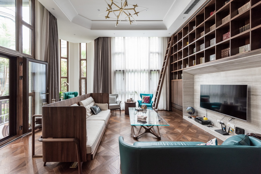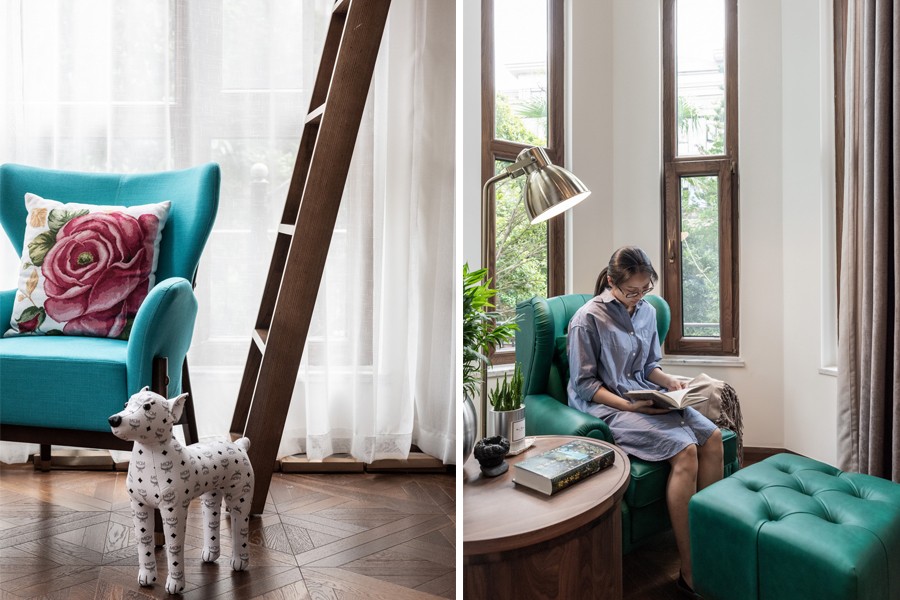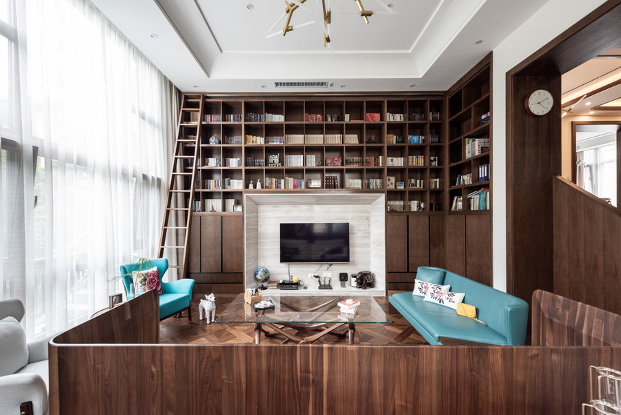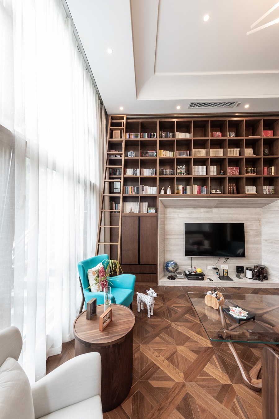 与业主交流时,我发现她特别喜欢看书,且家中自有大量藏书,同时她希望在家中营造良好的阅读氛围。于是我想到图书馆,它有高高的书架和取书的梯子。