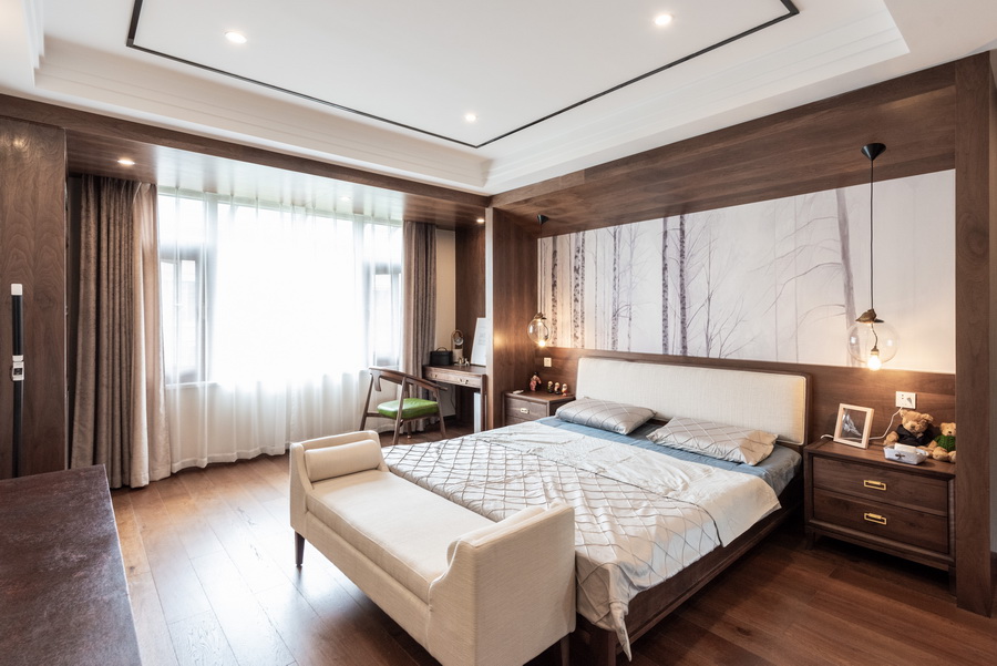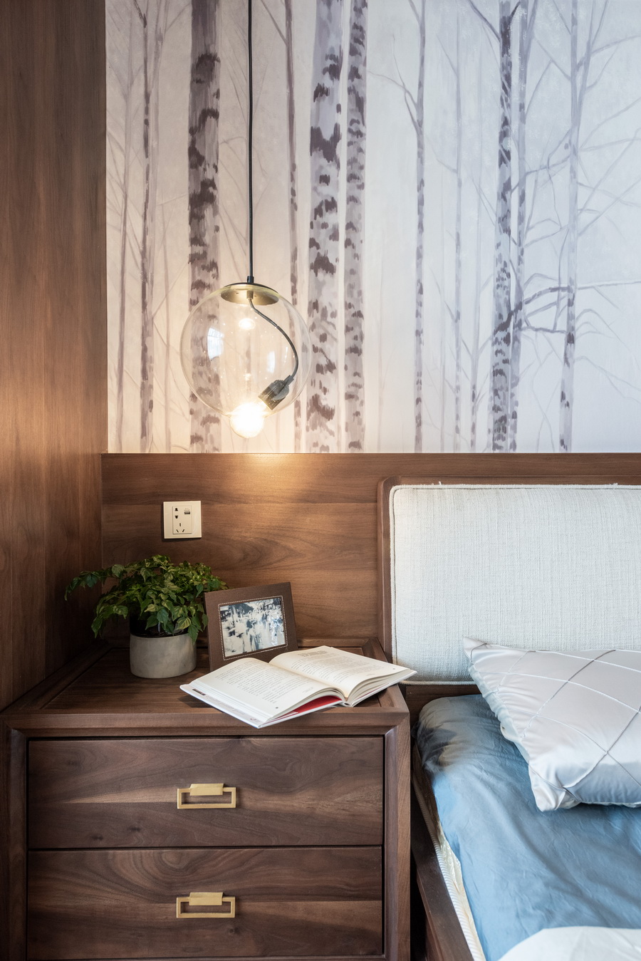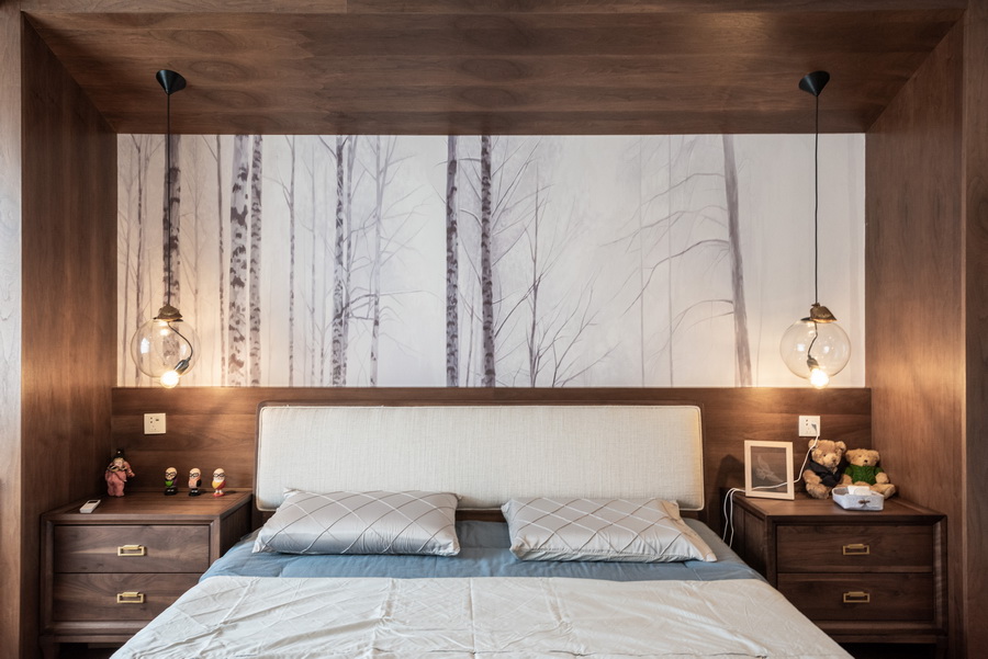 设计主卧时,我想起在大兴安岭度假时的情景。大雪过后森林静悄悄的沉睡了,而我在林中的小木屋里烤着火。看窗外白雪皑皑,屋里的我感到一丝暖意流入心中,这是幸福的感觉,我希望将这种幸福传递。于是我设计了温暖而静谧的就寝空间。