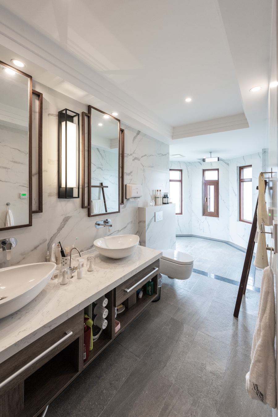 卫生间是品味的象征,它不应该只是空间中的边角料。它承载着我们生活中的日常,洗涤我们的身体,除去污垢,还原最美的自己。它为什么不可以阳光灿烂?空气清新?于是通透明亮的卫生间就此诞生。超大的顶喷花洒,让人随时可以体验雨中沐浴的感觉。