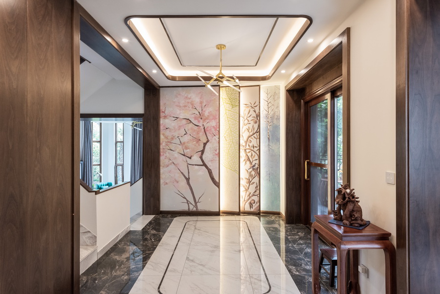 玄关是对于家来说是很重要的部位,进门的第一印象就是玄关。于是我在玄关设计上引入了“家中四季”的概念。而承载四季的是什么呢?我想到了书页。于是呈现了家中有四季的意境。