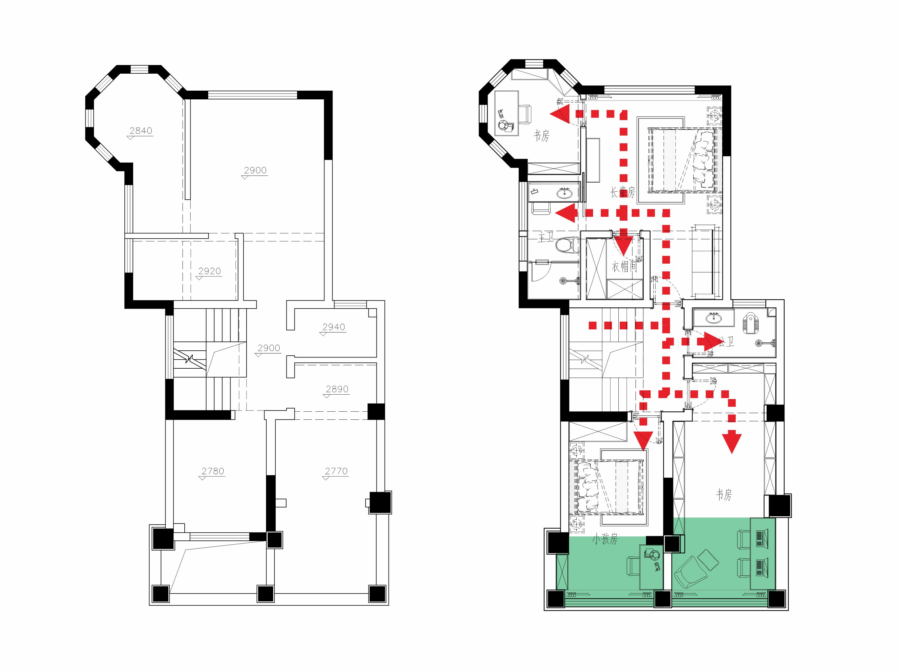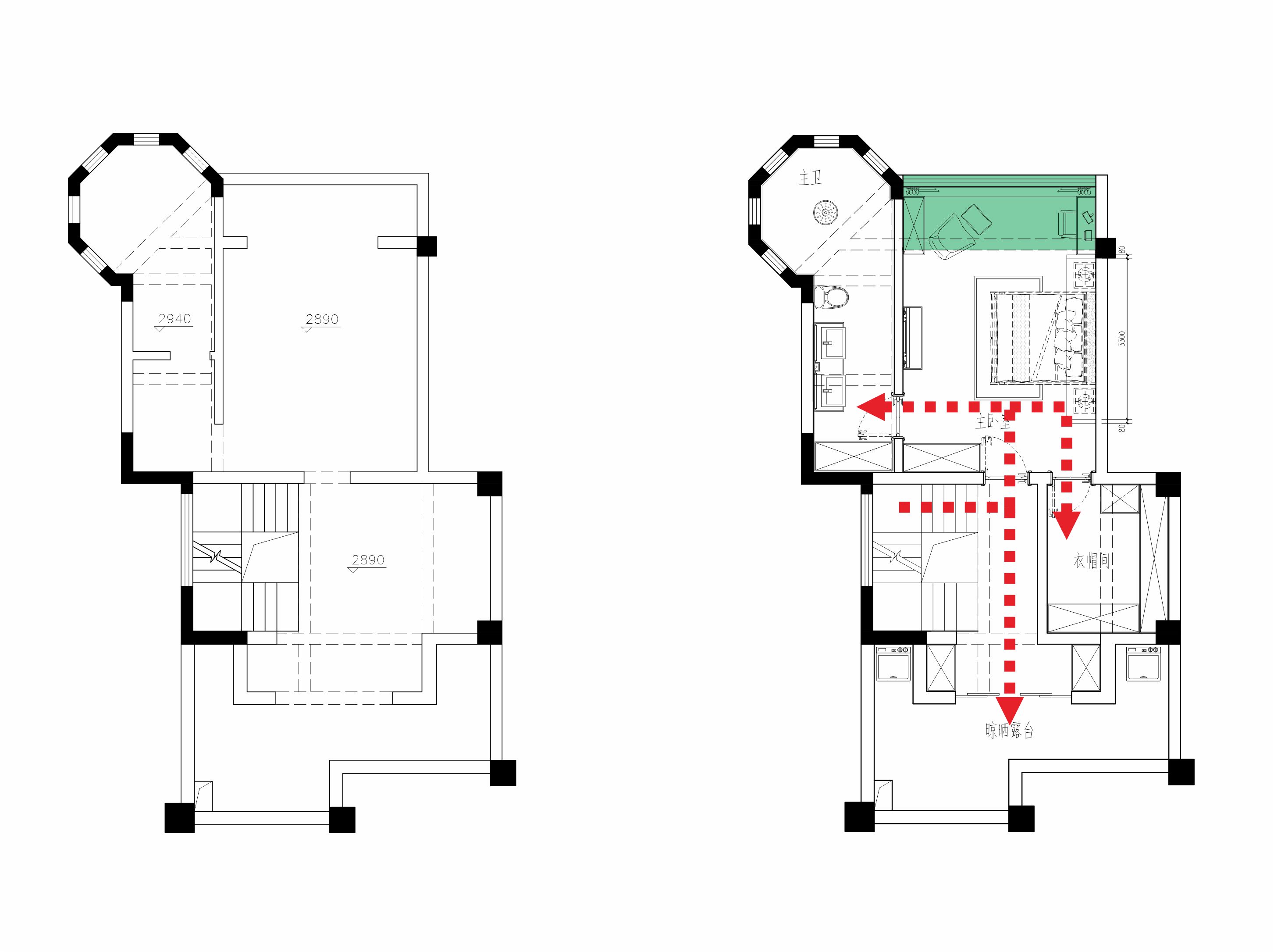 一个家,总有着承载记忆和感情的东西,我想这些东西保留下来是有意义的,于是我将它们放到长辈房中。通过对空间功能的重组,给业主创造了理想中的衣帽间和卫生间。
