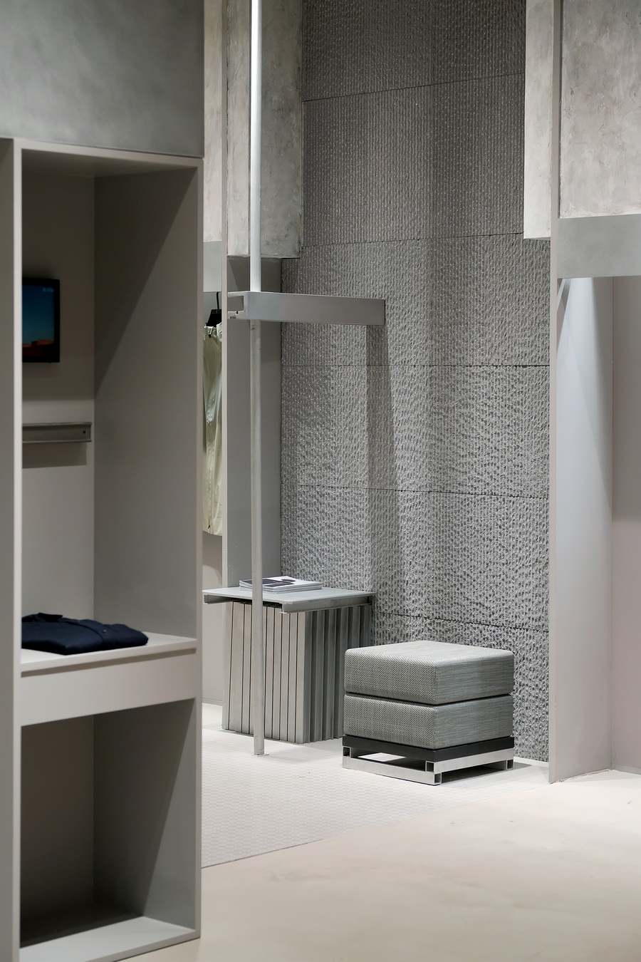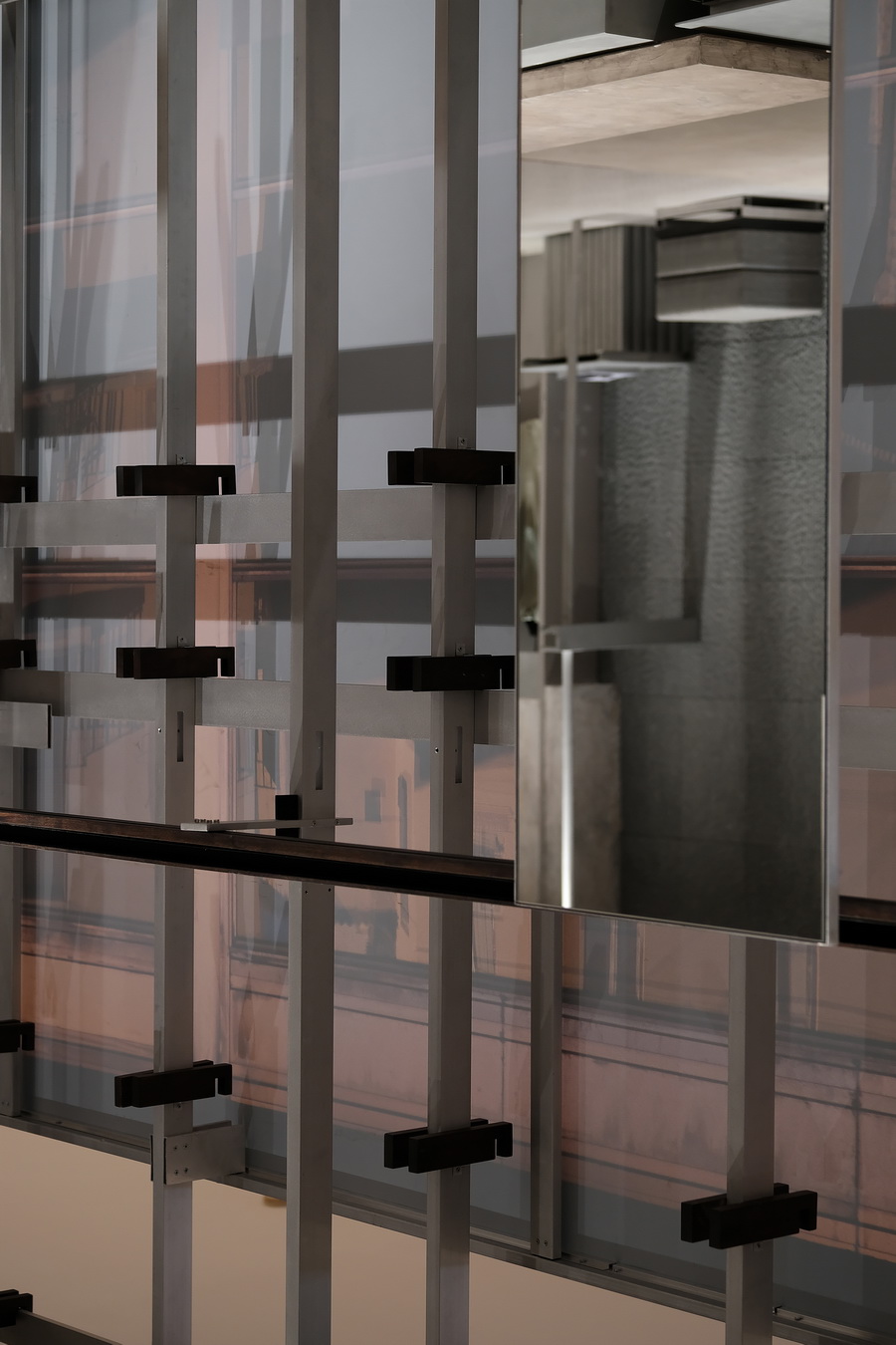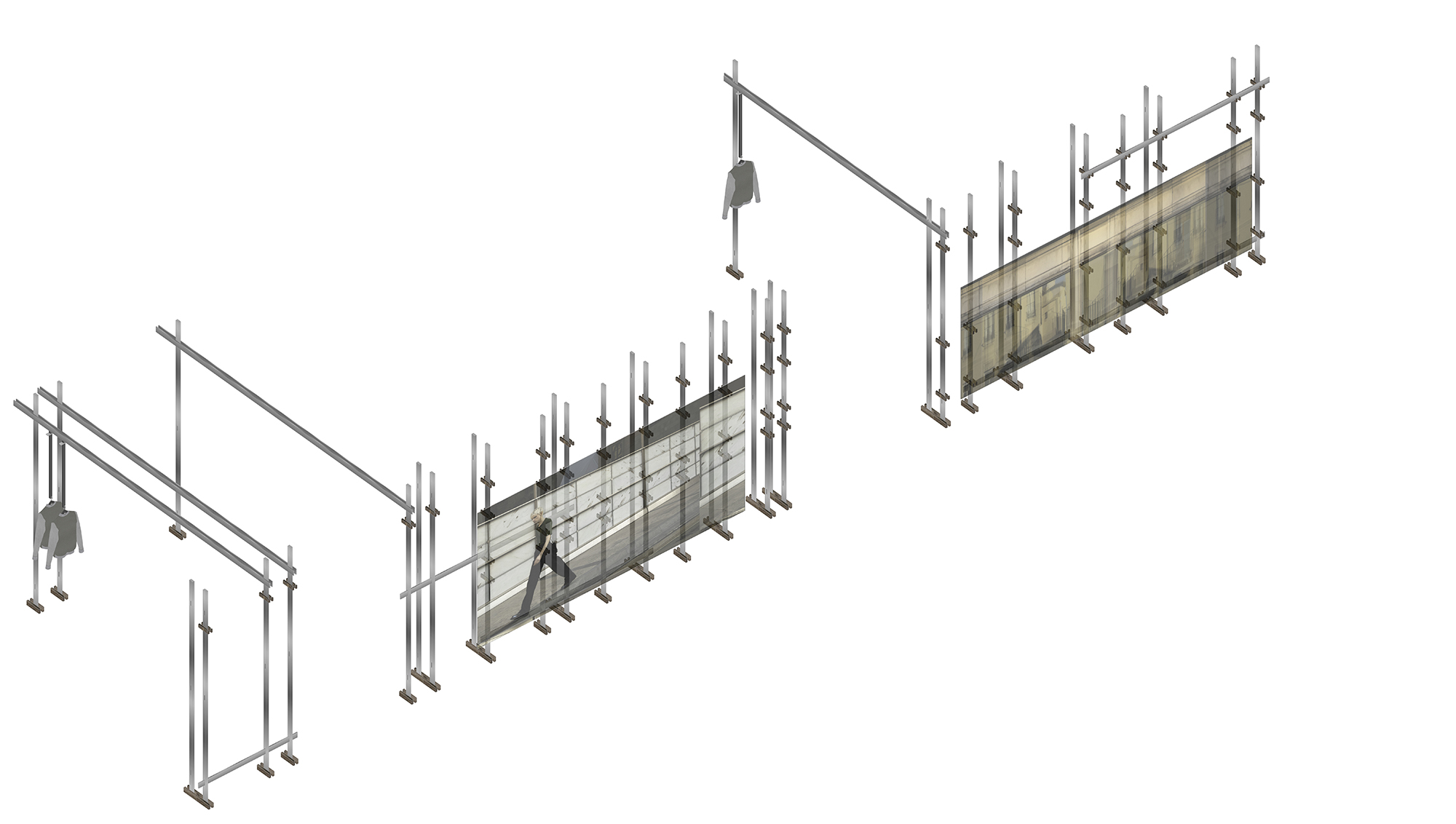 第二个部分也是从Palimpsest衍生出来的,以艺术家Rachel Whiteread为例,这位女艺术家在关注大型公共Casting艺术的同时,还在不断通过一些小的雕塑表达日常品,让这些日常品的痕迹通过另一种介质表达出来。在这次设计中,我们将日常的结构植入空间;例如我们的中岛试衣间在设计过程中是拿一个个柜体逐渐拼合而成的;我们的一些中岛道具形式也在模仿不同Object的拼贴,而空间的金属件应用了“工”字的形式无限复制黏贴。