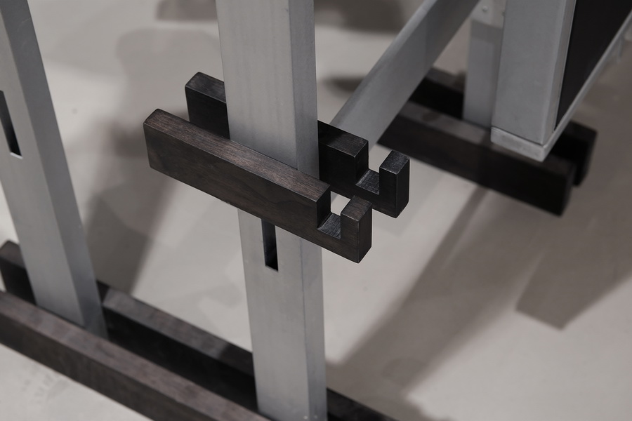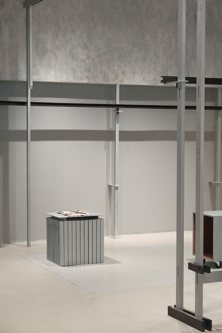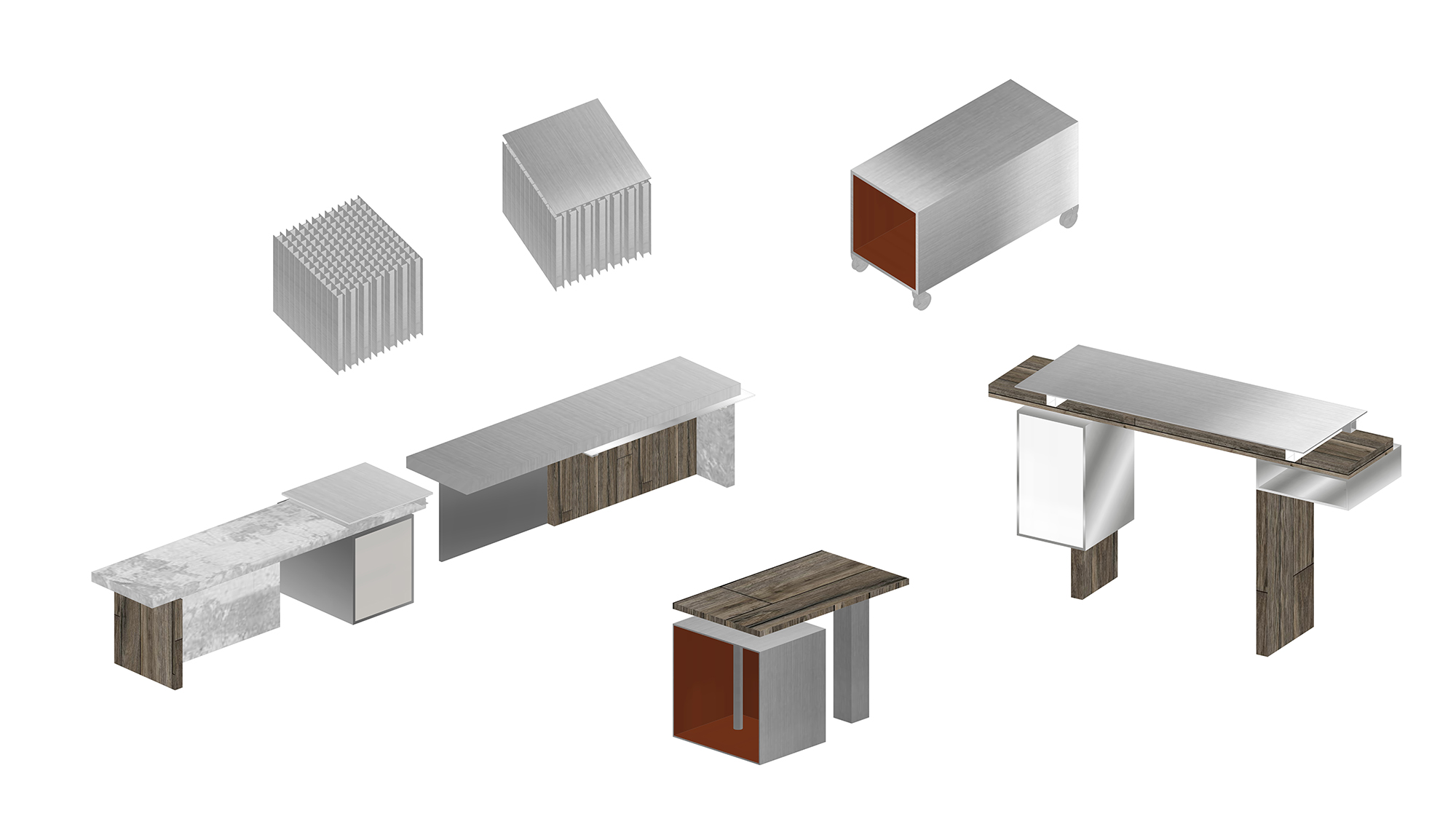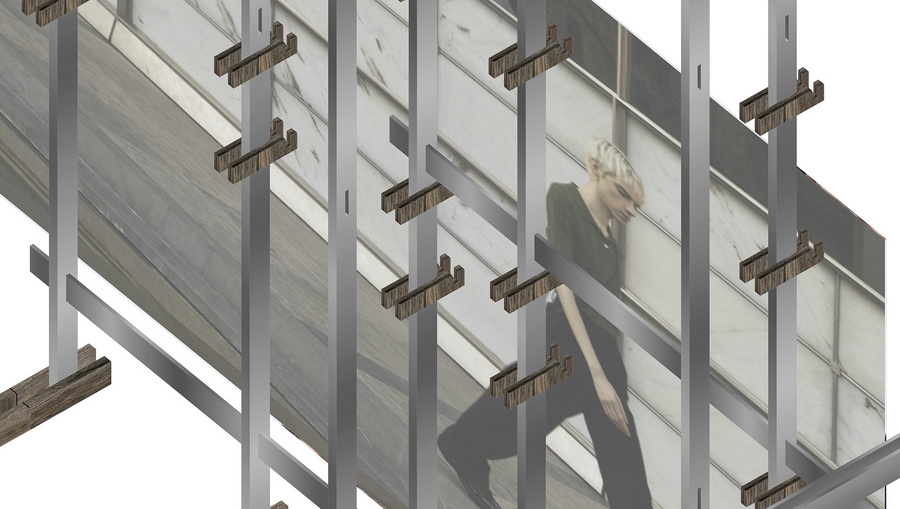 第二个部分也是从Palimpsest衍生出来的,以艺术家Rachel Whiteread为例,这位女艺术家在关注大型公共Casting艺术的同时,还在不断通过一些小的雕塑表达日常品,让这些日常品的痕迹通过另一种介质表达出来。在这次设计中,我们将日常的结构植入空间;例如我们的中岛试衣间在设计过程中是拿一个个柜体逐渐拼合而成的;我们的一些中岛道具形式也在模仿不同Object的拼贴,而空间的金属件应用了“工”字的形式无限复制黏贴。