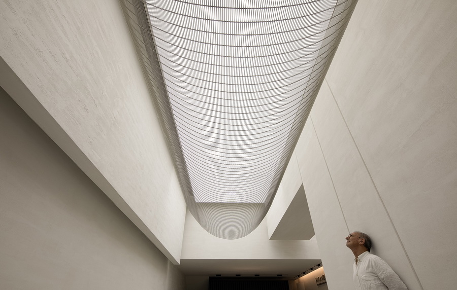 天花中的形体结构结合管线,以严谨的姿态,获得了该商场最高举架的店面,扭转了原本极度恶劣的空间感,这是一种极为巧妙的思考。空间以一种高挑向上的状态展示在我们面前,而入口垂钓的弧形金属网,在天花的拉膜与立面的形体之间形成了一片介质,丰富了光与空间的关系。让人产生强烈的好奇与探索的欲望。