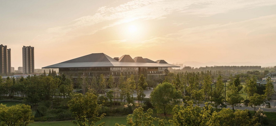 该项目关注于人体尺度空间的营造,以更好地吸引市民和游客的到访。展览馆凭借其戏剧化的屋面线条给初入园区的来访者留下了直观且深刻的印象。屋面的八座山峰还象征着场地附近的中山陵。每座山峰体积中空且在顶端设有圆孔,以更好地将自然光引入大平层,扮演采光井的空间功能。建筑师将其名为“光炮”,并在办公研发楼的设计中进一步强化了这一元素。“光炮”散布于八个五角形办公研发楼中,搭配广阔的室内庭院,彰显了该项目建筑的独特风格。研发大楼从小到大的体块尺度受到了中国传统建筑的灵感启发,突出外挑的屋檐将建筑空间固定在地面上,并给人以悬浮之感。而一旁起伏的景观屋则用于咖啡厅和商业零售空间所需,其有机的形态造型源于树木的枝杈结构。