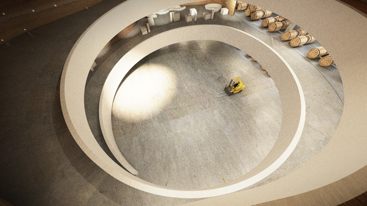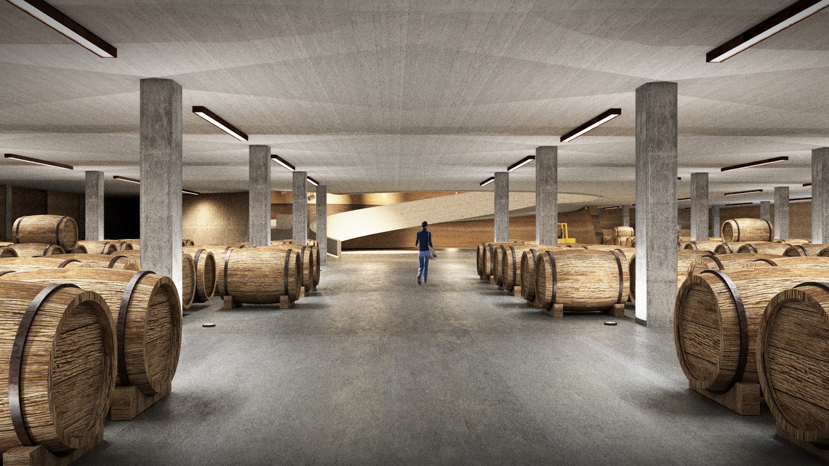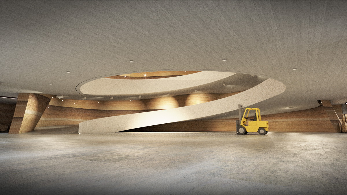 结束环形围绕的坡道空间,到达底层酒窖空间时,酒窖空间又变成了规矩本分的矩形空间。毕竟,矩形空间对于橡木桶的使用是相对比较方便的。