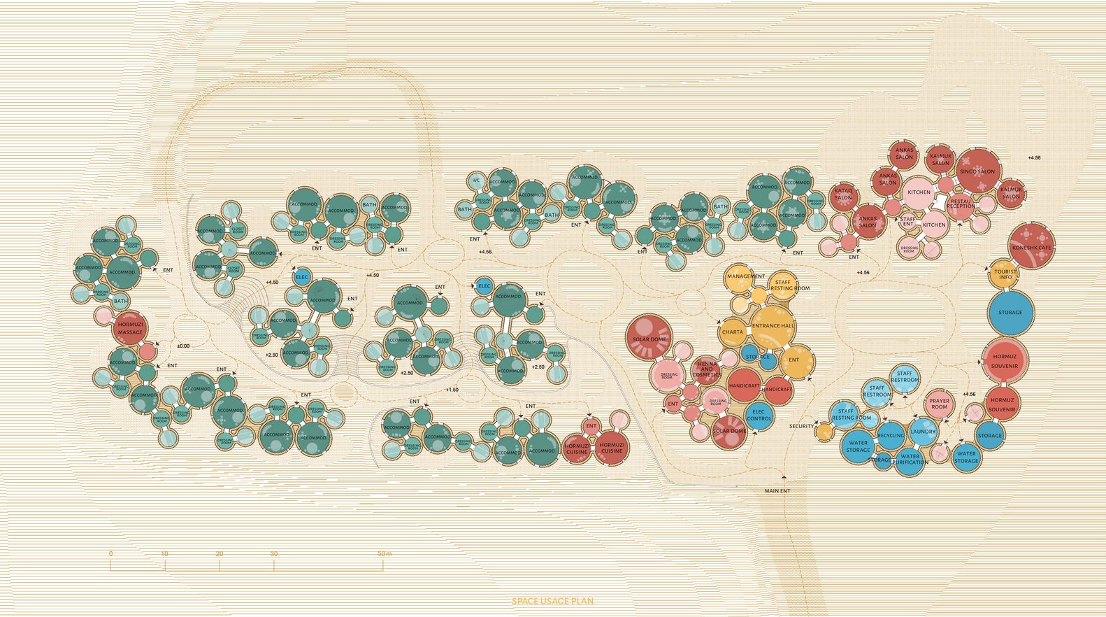 通过都市规划发展的方式为社区赋能:伊朗的霍尔木兹岛原是当地在波斯湾的一处重要历史港口,控制着来自中东的石油运输路线。虽然这座小岛有着许多超现实的自然景观,但其在当代旅游开发和经济发展中,却一直处于迷茫而又挣扎的状态。霍尔木兹岛的“存在感”系列项目(Presence in Hormoz)是由ZAV建筑事务所主导的都市规划发展项目,旨在通过设计为社区赋能。Majara居住区是该系列项目的第二阶段,作为一个多功能的文化居住场所,以在文化上和经济上将当地居民和游客连接在一起。