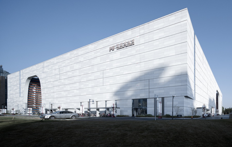 建筑外表平整朴实,饰以平整的、体量化的浅色石材幕墙,并有细致的纹理对比。内立面模仿层层叠砌的构造方式,塑造了砖红色玲珑曲面。这种内外对比隐喻了平凡外表下“内藏珍奇”的构思,使整座建筑物如原生璞玉剖开后透露光华,又如一座城池收藏文化与财富,呼应了“博库珍窑”的主题。