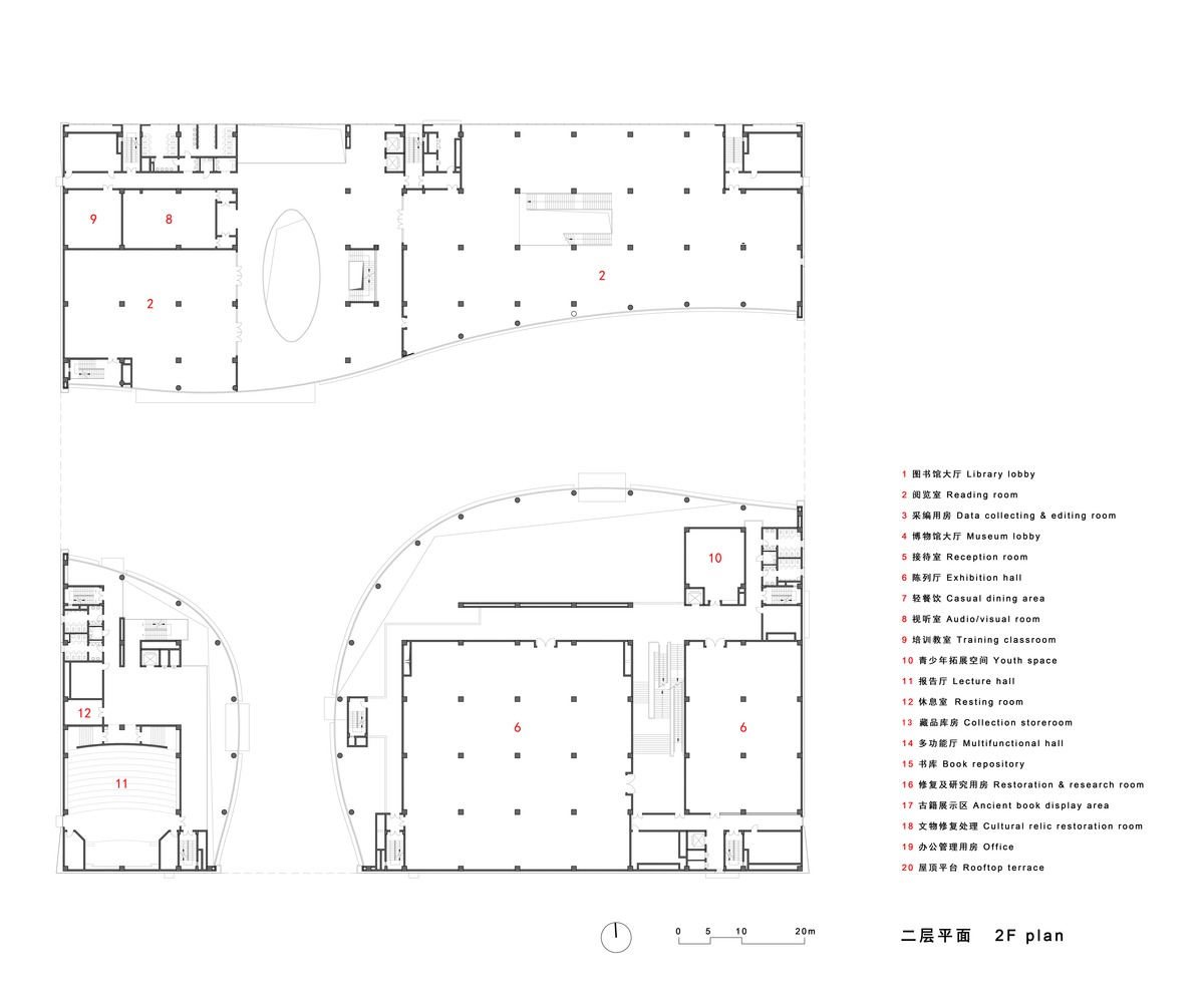 三个体量分别占据符合其功能的位置。东南角临十字路口为博物馆,立面封闭,并形成干净利落的城市标志性视角。北面临河为图书馆,南北两面均有足量的采光,并被博物馆阻隔而远离喧嚣的城市道路。西南角临城市开放景观空间是共享区,包含报告厅、简餐等两馆共享的设施。
