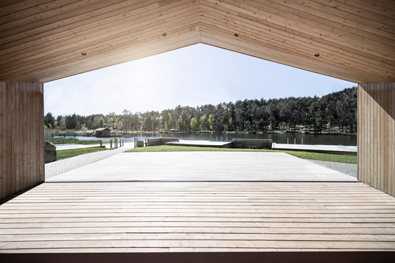 游泳小屋的每一个功能都包含在一个单独的空间里,咖啡馆建有一个倾斜的屋顶,可以呼应湖面的景色。