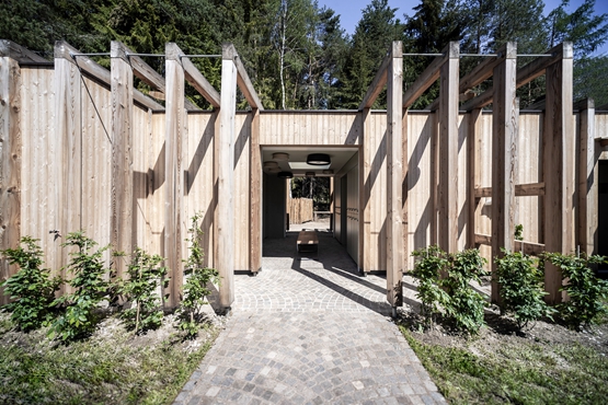 这座建筑有一个木制的框架,上面覆盖着落叶松木板,随着时间的推移,落叶松会变老变灰。变化的落叶松结构是为了支持攀缘植物,包括茉莉花,使其融入森林。