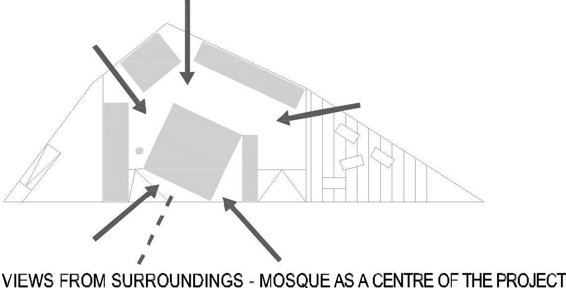 伊斯兰宗教与文化中心新址的“特色”之处在于其缺乏“特殊性”。它坐落于城市中心附近一处被遗弃和忘却的地方,这里处于破碎且未开发的状态,并有着未卜的城市前途。附近19世纪的萨拉热窝清真寺是由富裕的捐助者帮助打造的清真寺群,是城市发展新篇章的起点和一部分,而新的清真寺也背负着开启卢布尔雅那新历史的使命。