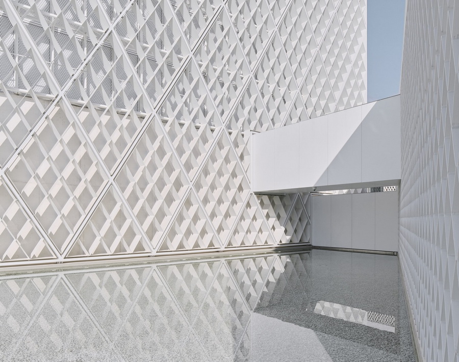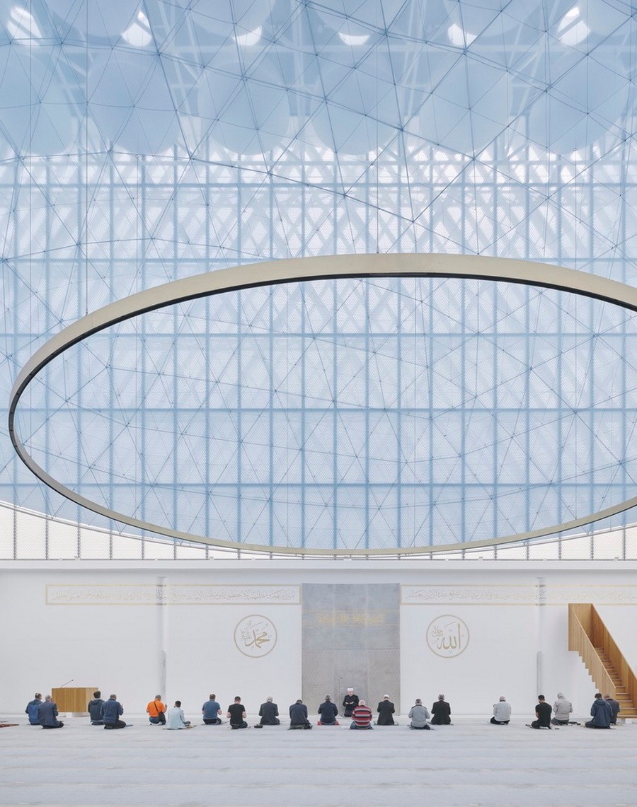 这座清真寺位于广场上,并对其完全开放,以此让祈祷空间可以在大型聚会期间延伸至外部,并成为新建筑群的核心部分。建筑并没有遵照熟悉的历史先例或者最近有着明显标识的样式建造,而是以钢材作为主要结构,打造了一个由1米(45厘米)深和仅有2厘米(8厘米)厚的钢制格栅结构组成的32/32/24米的盒子,其底部为白色混凝土,上部则为透明玻璃,以此让阳光泛入内部空间。