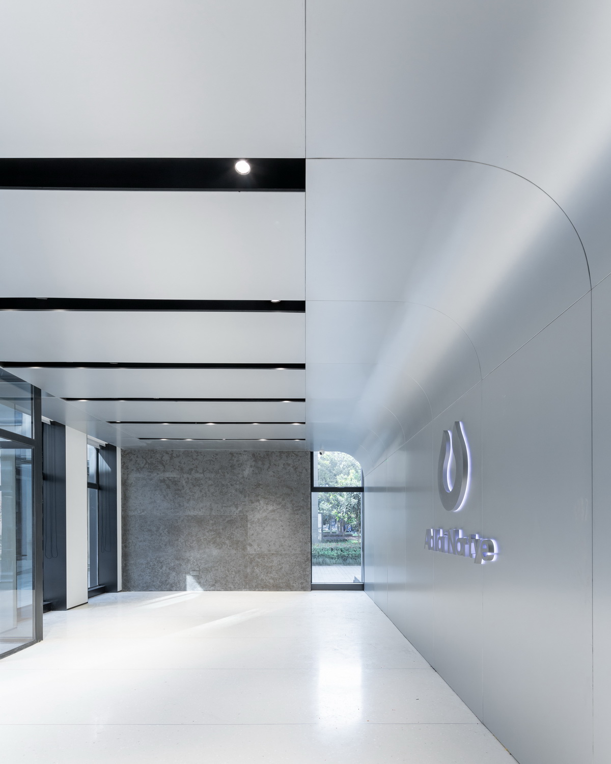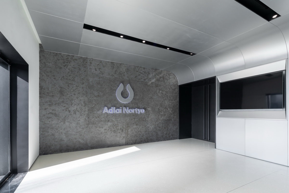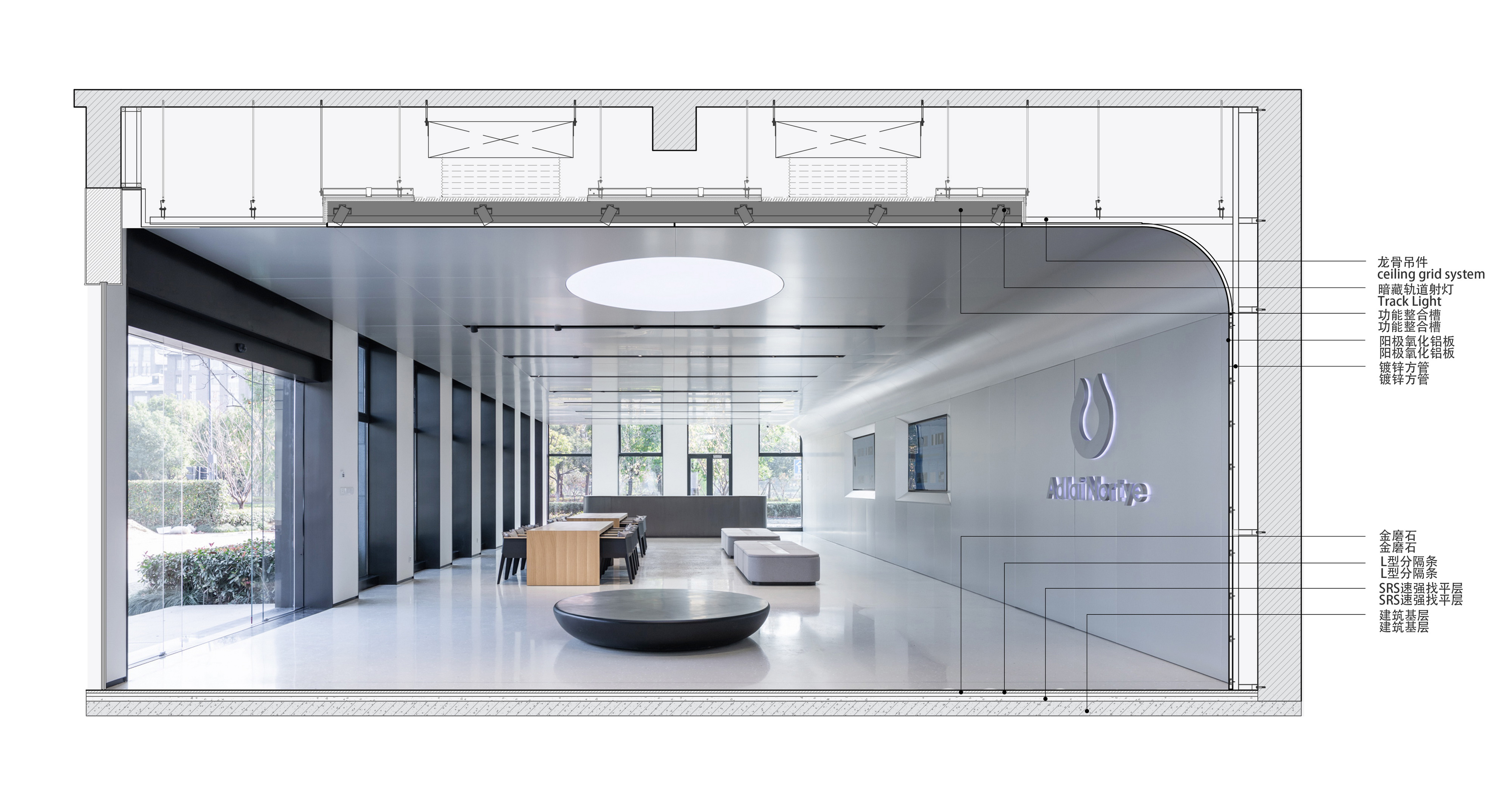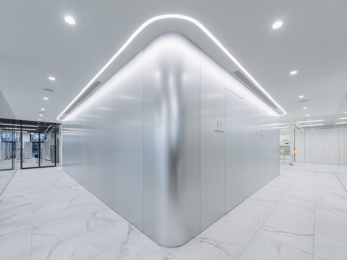 阳极氧化铝板和金磨石这两种极致材料的使用,让我们的设计洁癖得以实现。对比了各种不同属性的金属材料后,我们最终选择了阳极氧化铝板,电化学氧化带来的质感更加真实细腻,且满足生物医药行业的抗污抗腐蚀要求。所有铝板覆盖的完成面,我们都坚持一体化的极简设计。天花处,预制的集成设备盒将照明,消防,暖通及智能化系统全部隐藏。墙面处,密缝拼接的铝板暗藏所有的消防门及设备间,所有的分缝必须精确至3毫米。我们很任性的要求地面材料必须严格守齐窗间墙以及铝板分缝,具有更强耐磨耐污性的金磨石成为了唯一的选择。与此同时,金磨石的基层颜色,石子密度以及打磨的光泽度则成为了挑战供应商,施工方和设计团队极限的难题。为了追求现实世界中的物理极致,我们完成的是一次高阶的材料修炼。