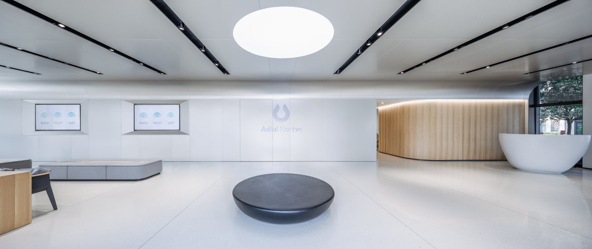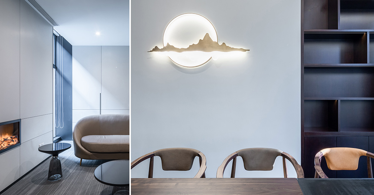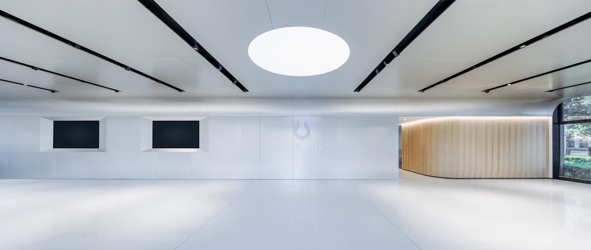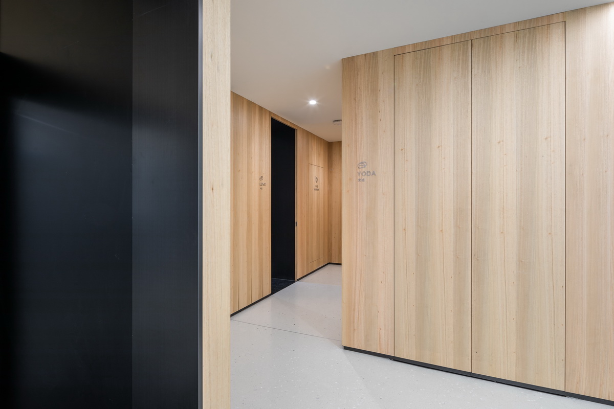 杉纹尤加利以优雅的圆角给空间带来温度,平行的内凹灯带如行星轨道引导进入相对私密的细胞空间。开敞通透的会议空间,内嵌开放的茶水吧,暗门背后的禅意茶室与拥有温暖壁炉的贵宾接待,是仪式感背后的精致美学。位于入口处的黑色圆盘装置,与天花的白光圆形顶膜,代表原力的黑白二重性,以一种抽象的极简美学展示企业的精神内核。