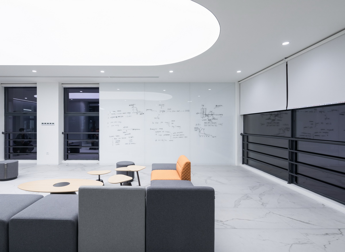 2至4层是研发中心的核心区域,每层设置一条通亮的参观走道,大开面玻璃一侧是复杂的实验室系统,另一层是被铝板覆盖的核心筒。在每层走道的入口处,我们说服阿诺团队在宝贵的实验室区域空出了一个近80平方米的共享空间。感谢阿诺团队,在此处留白,是非常奢侈的设计构想。共享空间中,不同于实验室严苛的照明系统,我们设计了一个巨大的发光膜顶棚,温柔的照度让人放松。每一层共享空间布置了能满足不同姿态的家具软装,自由曲线的沙发组合,无限旋转的陀螺椅,可爱的蓝鲸鱼玩偶,可升降且不倒的红酒椅,站立式可移动木桌,甚至还有一个充气拳击柱。反正,怎么舒服怎么来。