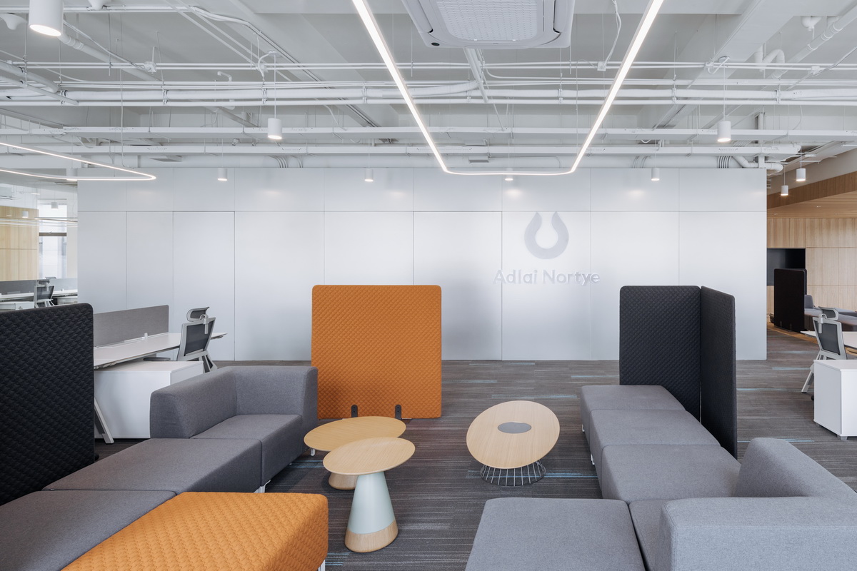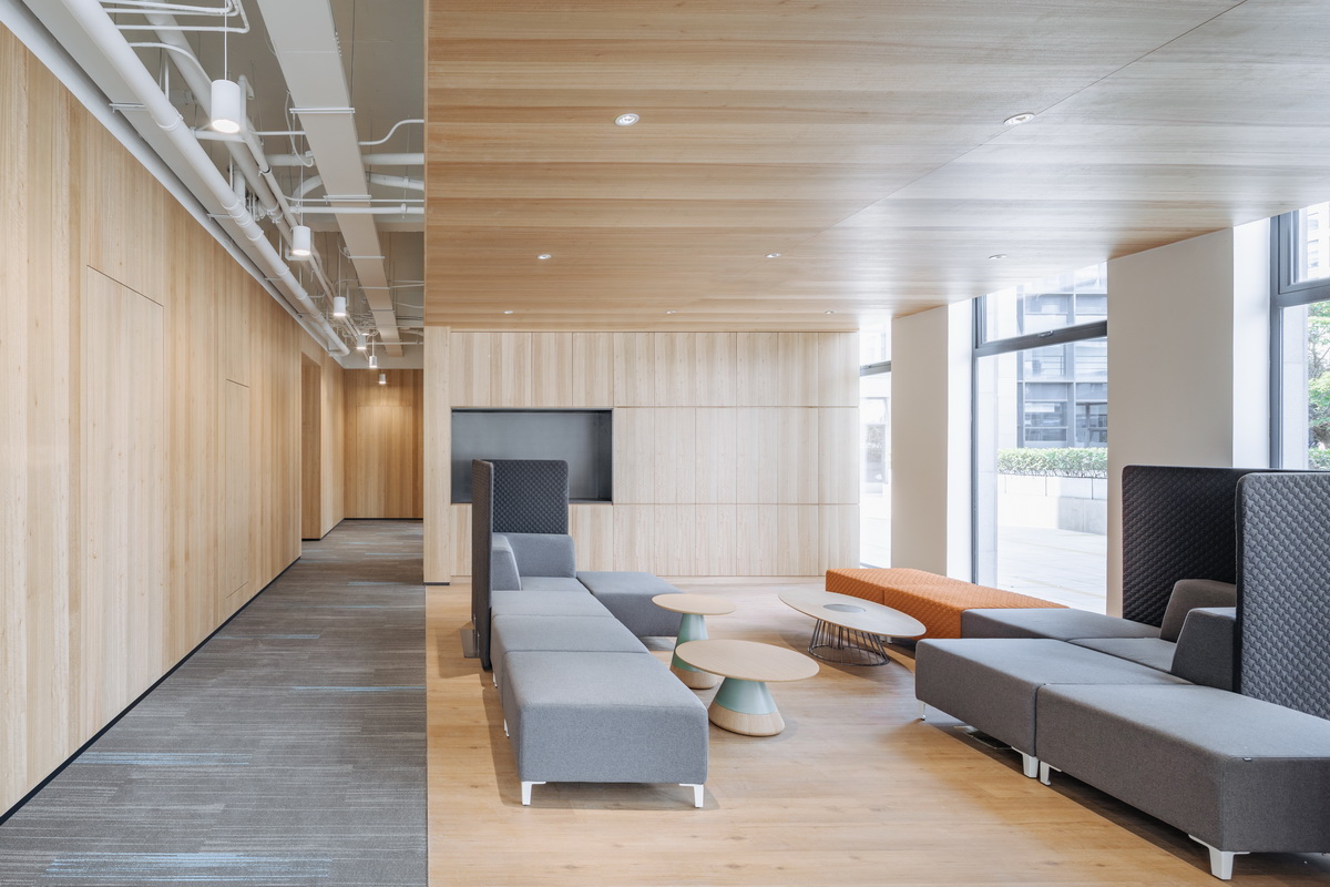 有别于6号楼极具仪式感的设计策略,8号楼本身就是被钢筋混凝土包裹着的各种精密设备和仪器,我们需要添加温度和活力,给在此长时间工作的科学家更多的自由自在。首层的开放办公,我们的目标是打破传统强排式的工位区,激活空间的使用活力值。我们把不同规格的会议室,开敞的茶水间以及配有沙发组合的开放讨论区分散在空间中,以满足科学家不需要长时间依赖固定工位,而需要随时小组讨论的工作模式。