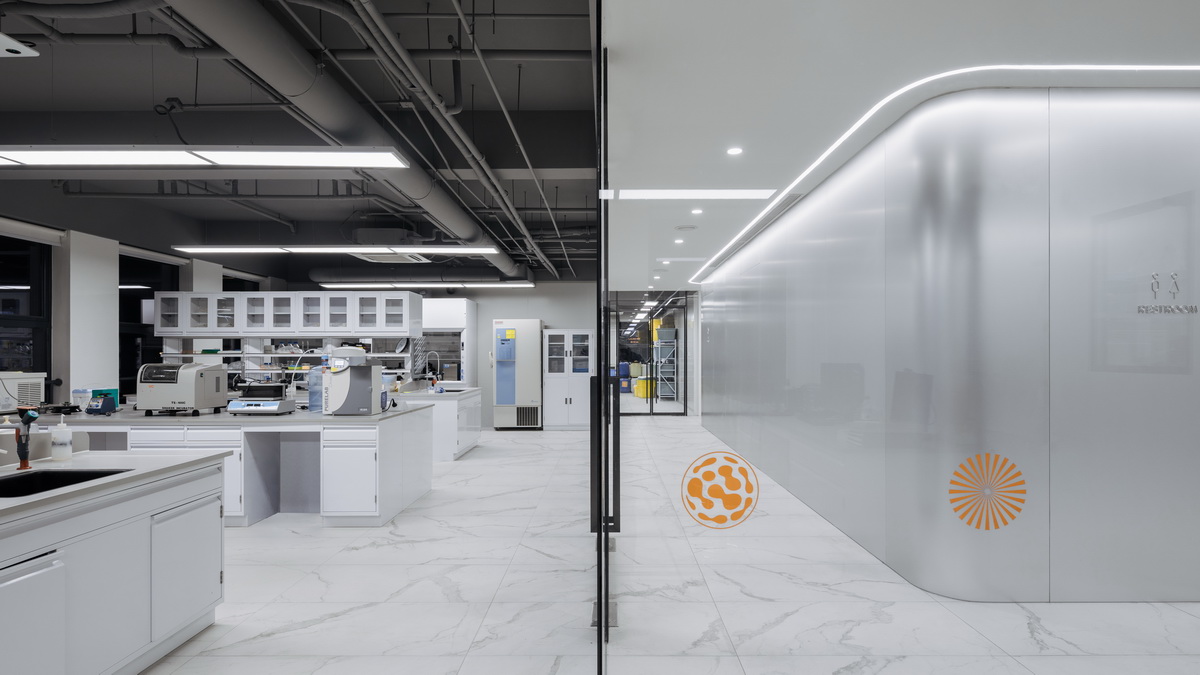 在概念设计阶段,我们就强烈建议业主邀请平面设计团队加入,提前开展空间标识的设计工作,由此带来的效果显著。非常感谢SHUN Design对空间的深刻理解,空间标识设计具有直观的生物科技元素,橙色作为辅助色带来了温度,抽象的二维平面标识系统,让空间与标识相得益彰,避免了不同逻辑的设计语言,统一了空间的格调。