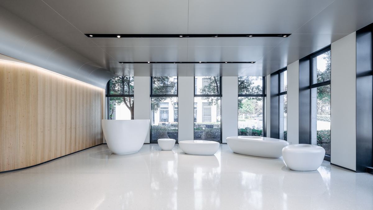 一系列定制家具的布置,提供了迎宾、接待、洽谈和展示的多重功能。除了大吧台,所有的定制家具都可以移动,为了满足企业发布会和内部团建的需求。它不是传统意义的企业大堂,没有咄咄逼人的前台,取而代之是一连串水滴造型的聚落,配以绿植,让人能安心而自由的落座。它也不是习以为常的企业展厅,摒弃了冗长且华而不实的企业展示,非常克制的布置了两个超大尺寸的显示屏。