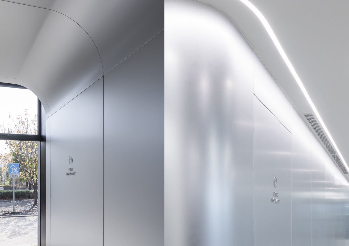 6号楼的一大一小双门厅与8号楼的南侧门厅共用一个母体,阳极氧化铝板从主墙面覆盖至天花吊顶,犹如宇宙空间站的舱体造型,唤起硬核科幻电影的场景记忆。行政办公人员,科学家,来访参观人员从不同的入口进入,相同的材料质感与空间形态提供统一的空间体验。在空间记忆层面上,宇宙空间站的重复母体形成一种企业文化基因的潜意识输出。