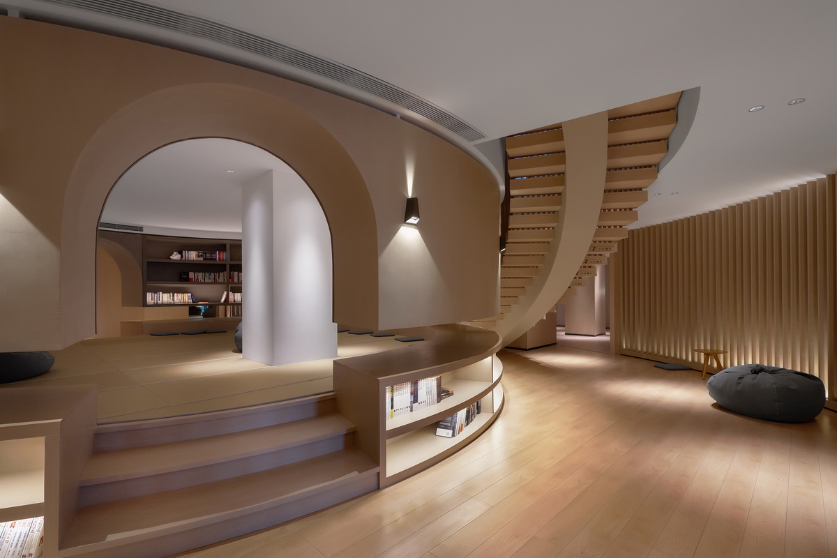 2、榻榻米娱乐区身后“别有洞天”,二层360度环绕圆形书吧类似的“迷你钟书阁”,双层圆环书架和竖条格栅围合出一个相对独立的静谧空间,点状光源使得这个同心圆环形空间在拍照之余,真正的阅读成为可能。穿过拱门拾级而上,三层还有个隐藏的“自然角”。