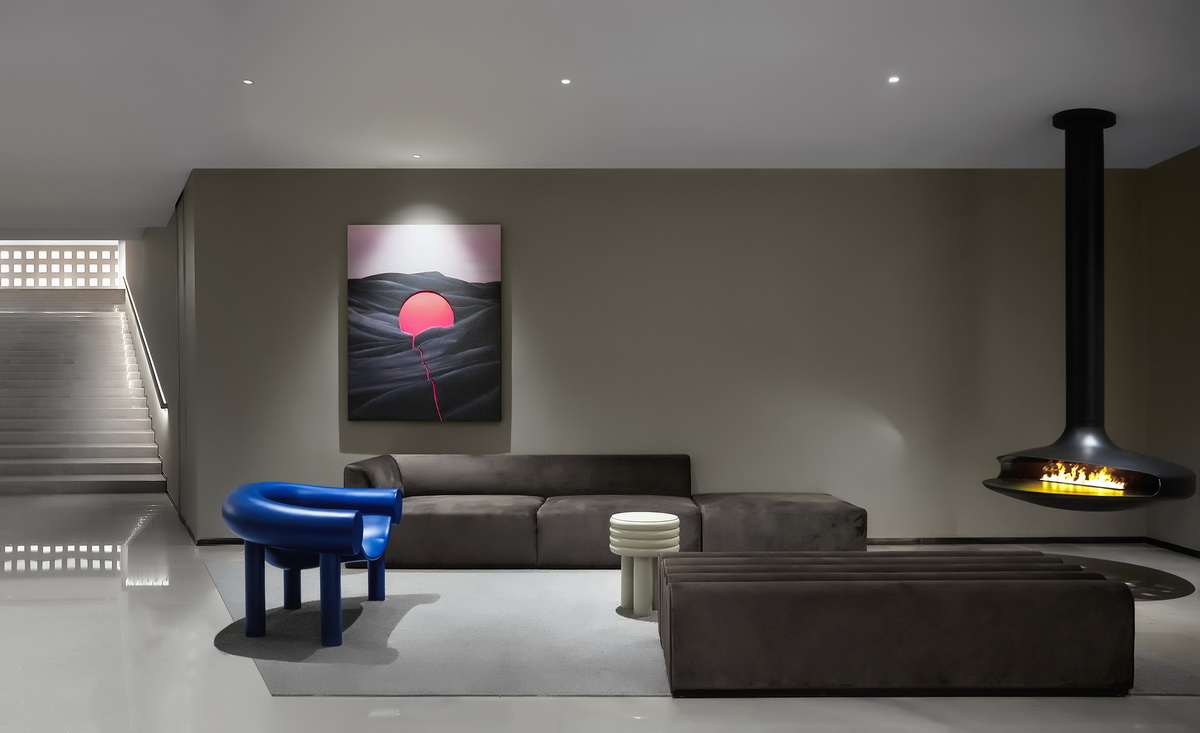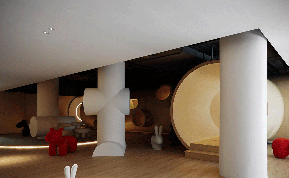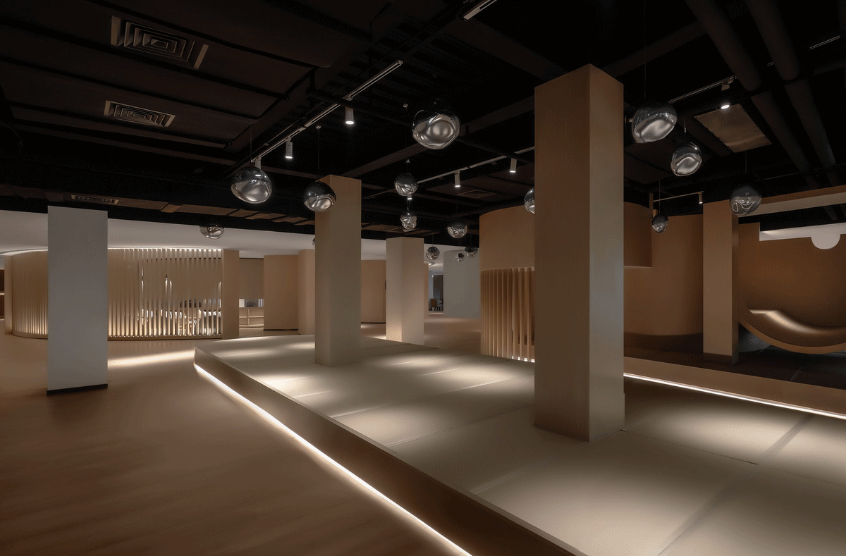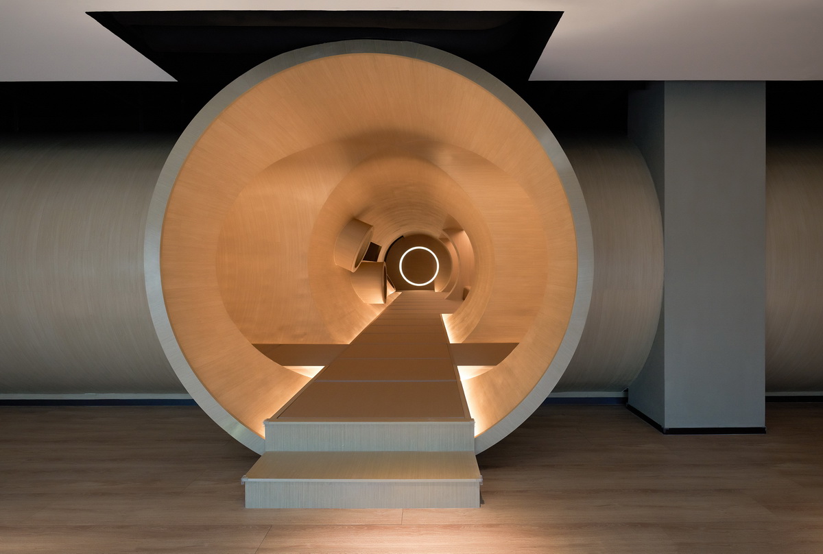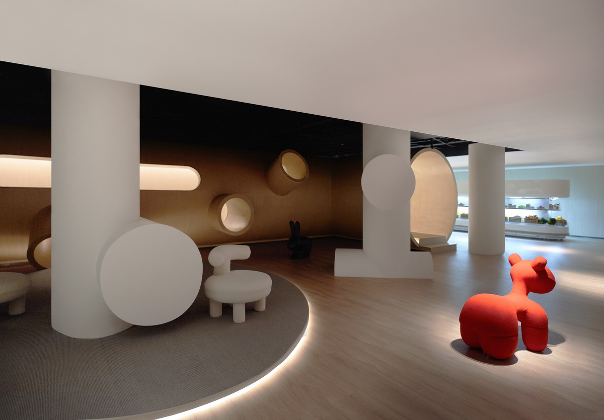 被景观楼梯自然分割的两侧空间,是主要活动区。它们像城镇街区围绕着主城区“广场”向外生长,功能之间的动线如川流不息的“街道”。这其中最惹人逗留的是“树洞”长廊,它位于餐厅和水吧之间,以“儿童乐园”的名义存在。几何简化后、树洞般的的长廊形式感强、层次丰富,提供多种独特角度,许多人在这里拍出了不输杂志封面的大片!