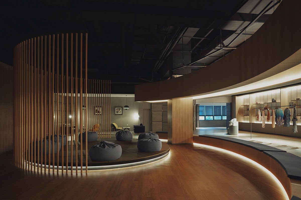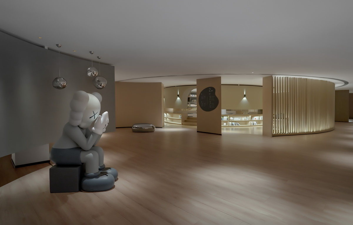 1、潮流文化标志KAWS背后的榻榻米娱乐区天花造型十分丰富,似树洞又像山穴,懒人沙发高低错落、似隔还透,不同程度私密性的小空间很适合独自休息或者打游戏。不同的材质和半开放半私密的隔断与弯弯曲曲的有机形态,打破了格子间的单一划分。