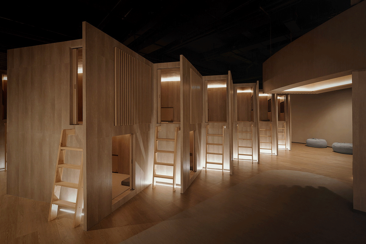 此外,他还需要为有社交娱乐需求的朋友设计安静的“图书馆”、天真的“儿童乐园”、轰趴的“桌游室”、喧闹的“游戏厅”和“迷你KTV”,以及粉嫩的“美甲店”等;最后,王兵把用来休憩的空间分为了私密程度不同的下沉冥想区、榻榻米、睡眠舱、休息大厅和“宾馆”客房。