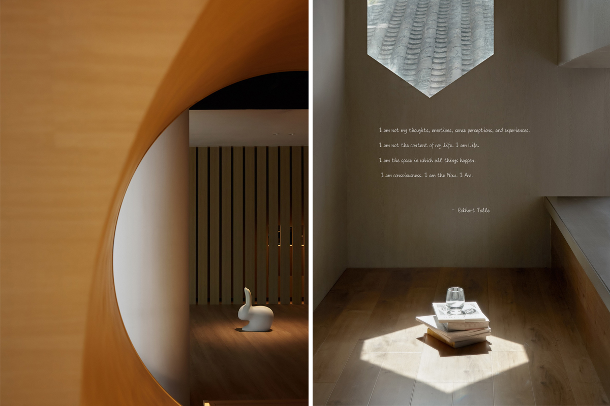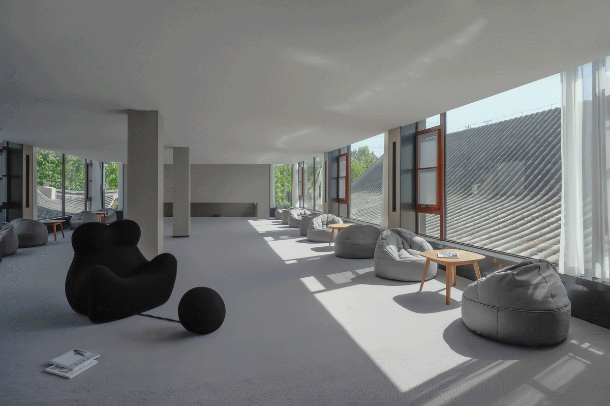 3、屋顶茶室不同于普通的夸张视觉形式感,宁静而别具地方特色——连绵的青砖黛瓦如今在北京已经是稀缺资源,所以视角很好的屋顶露台成为了最佳的“景观位”。何况青瓦间还点缀着质感细腻的三角形阁楼茶室,连屋脊兽都能看得清清楚楚。温暖实木配合米色内饰,营造出日式亲密氛围。