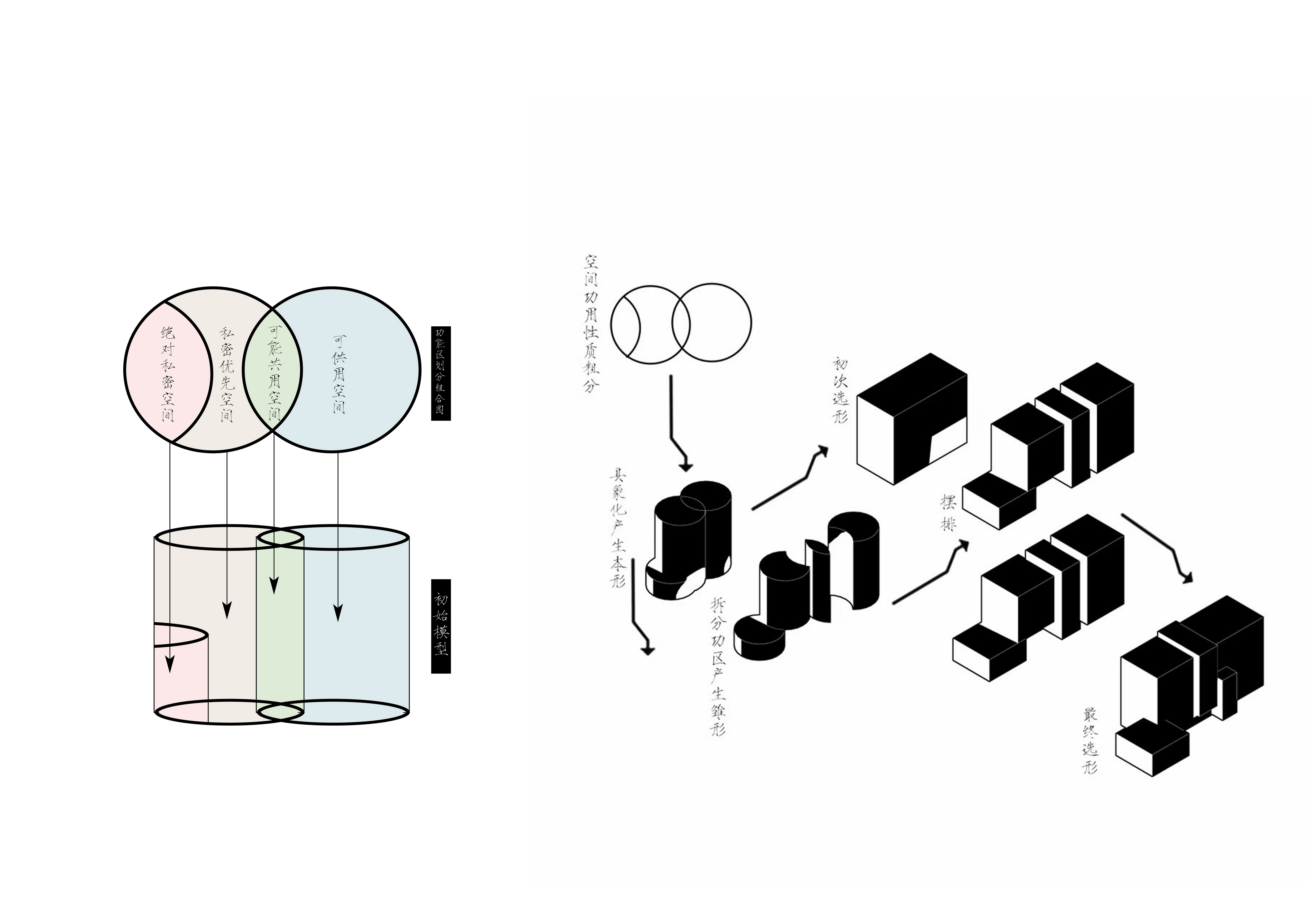 在经过对会产生“相遇”的空间进行简单侧写以及对场地的分析后,我们便得到了一张最为简单的分区图。尔后再对空间配比做出初步判断以及对造型母题进行筛选和摆排后,我们确定了其基本构形。对于这一公共空间的设想,也成为整个项目设计过程的起始点。