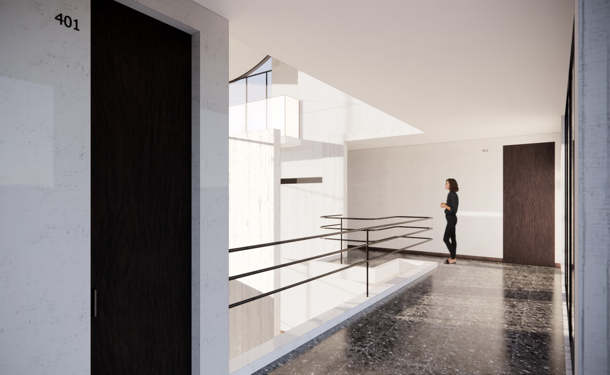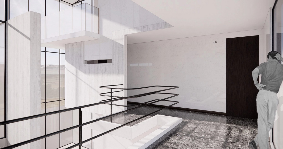 该项目毗邻土楼景区,间隔仅数百米左右。因此我们将公共空间的主视野面定在东侧,并且完全的打开。另外,我们淡化了公共空间内“楼层”的存在感,试图将其设计为大空间式的,非格式化的。这样的做法是希望每层的住户皆可以“参与”进这一空间,或是在“行走”的过程中可随时感受到因为时间与空间变化而带来的诸如视觉等体感上的差异。随着楼层的变化,“参与”的方式也随之改变。例如四层和五层仅有挑出的内阳台于此空间内,居住者或更多以“观看者”的身份参与这一空间。而在二层三层的住户,则或更多以“使用者”的身份参与其中。但是,这样的设想绝非固态。对于行为的限定是不存在的。人在此空间内的行为,应当是完全自主的。我们希望“停”,“坐”“卧”等静态行为应当大量发生于此,但绝不限于此。各种行为与行为反馈所产生的可能性将聚集于此,以制造出一处主与客居住诗意的汇流之地。
