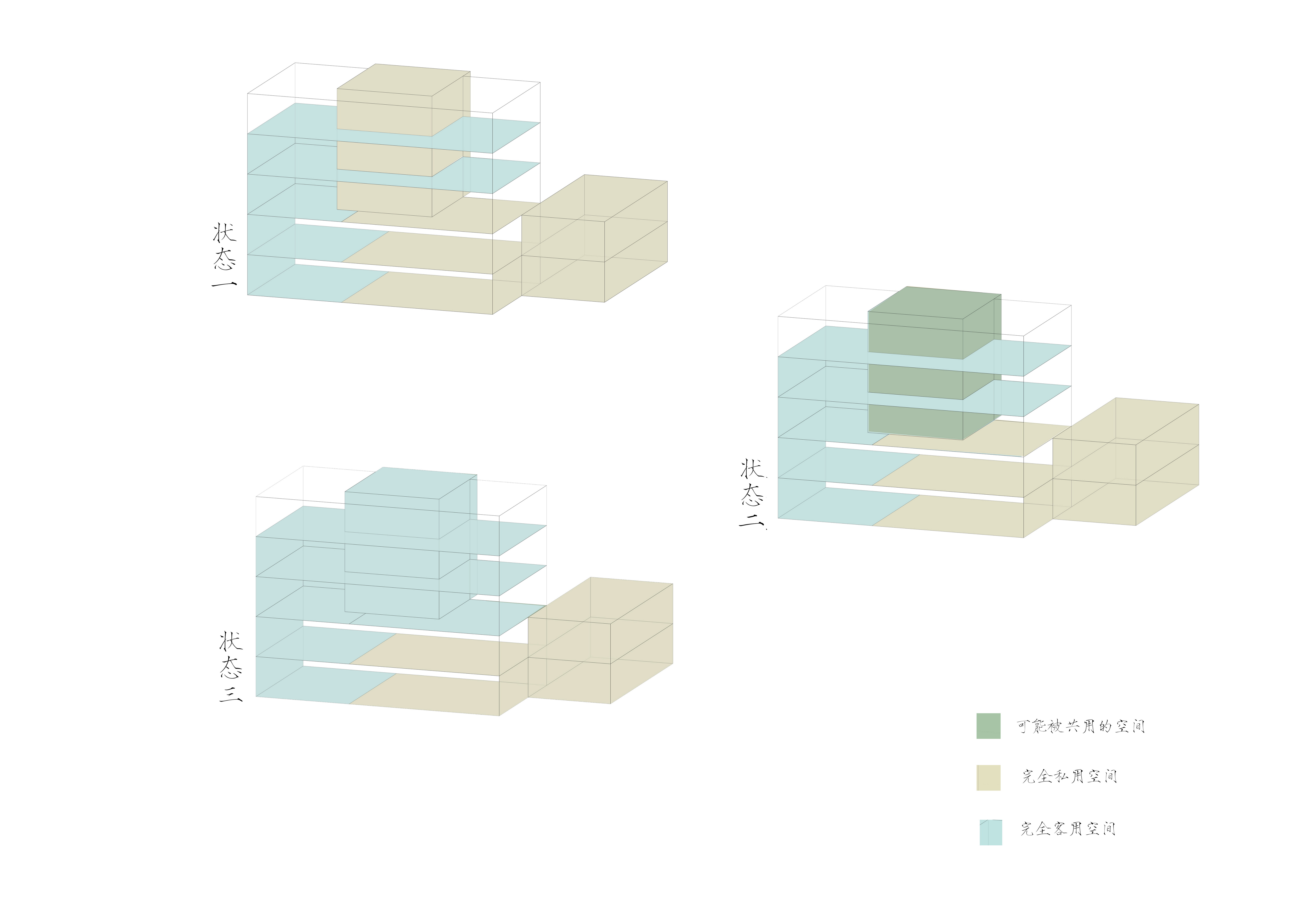 (对于不同使用情况下,各部空间使用状态的分析:状态一:客少或无客,主人家庭人员聚集较多。在此情况下,常备客房可做家用,或保留以备需求,此情况主人家使用自由度最大。状态二:有客,主人家庭成员数量正常。在此情况下空间各自发挥功用。茶室将作为公共空间被共同使用,此情况下主人使用自由度略大于客人。状态三:主人家小家庭居住,客人数量较多。在此情况下,三楼原主卧亦可作为民宿房间供出经营,即便如此,只需选择长闭分区门,主人家生活的私密性与质量依旧得以保证。此状态下住客使用自由度大于主人。)