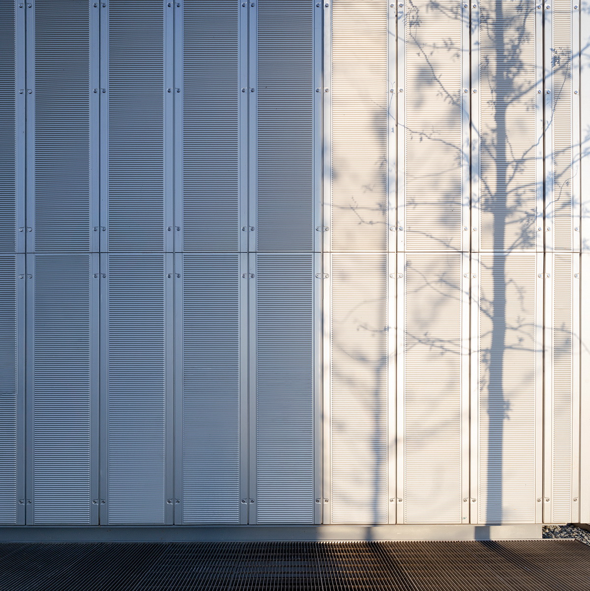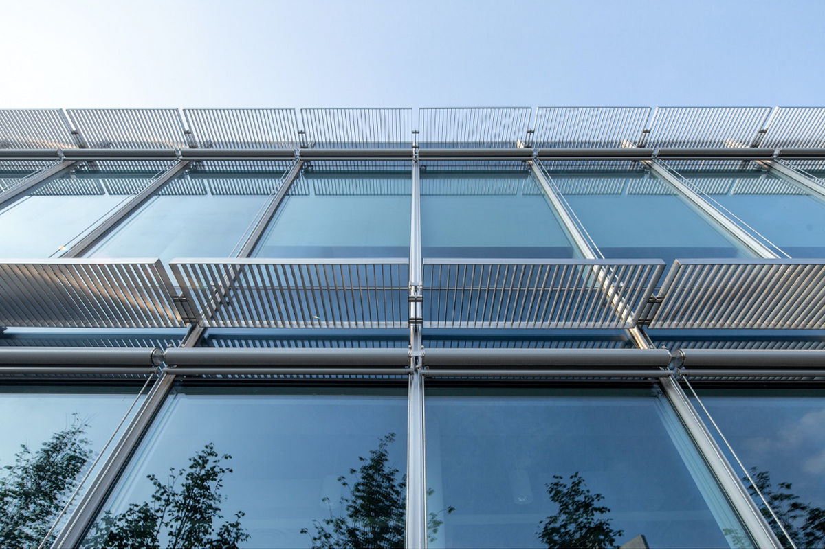 朝向中央庭院的立面二层以及露台至屋面(八~九层)均安装了意大利进口的电动遮阳系统。二层选用的是电动折臂导轨系统,并在设计师坚持下选用了独一无二的“RPBW绿”;露台层选用的是电动垂直升降导轨系统。