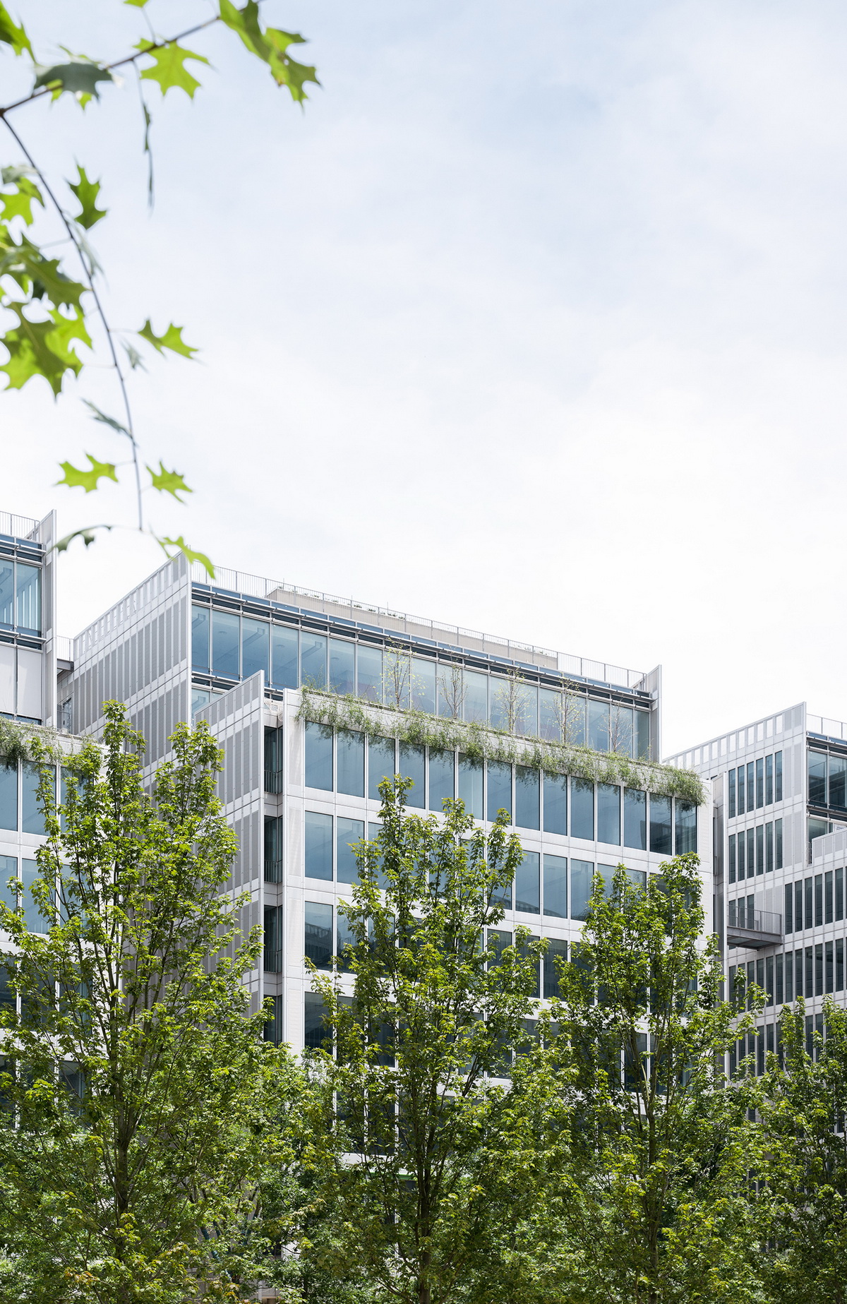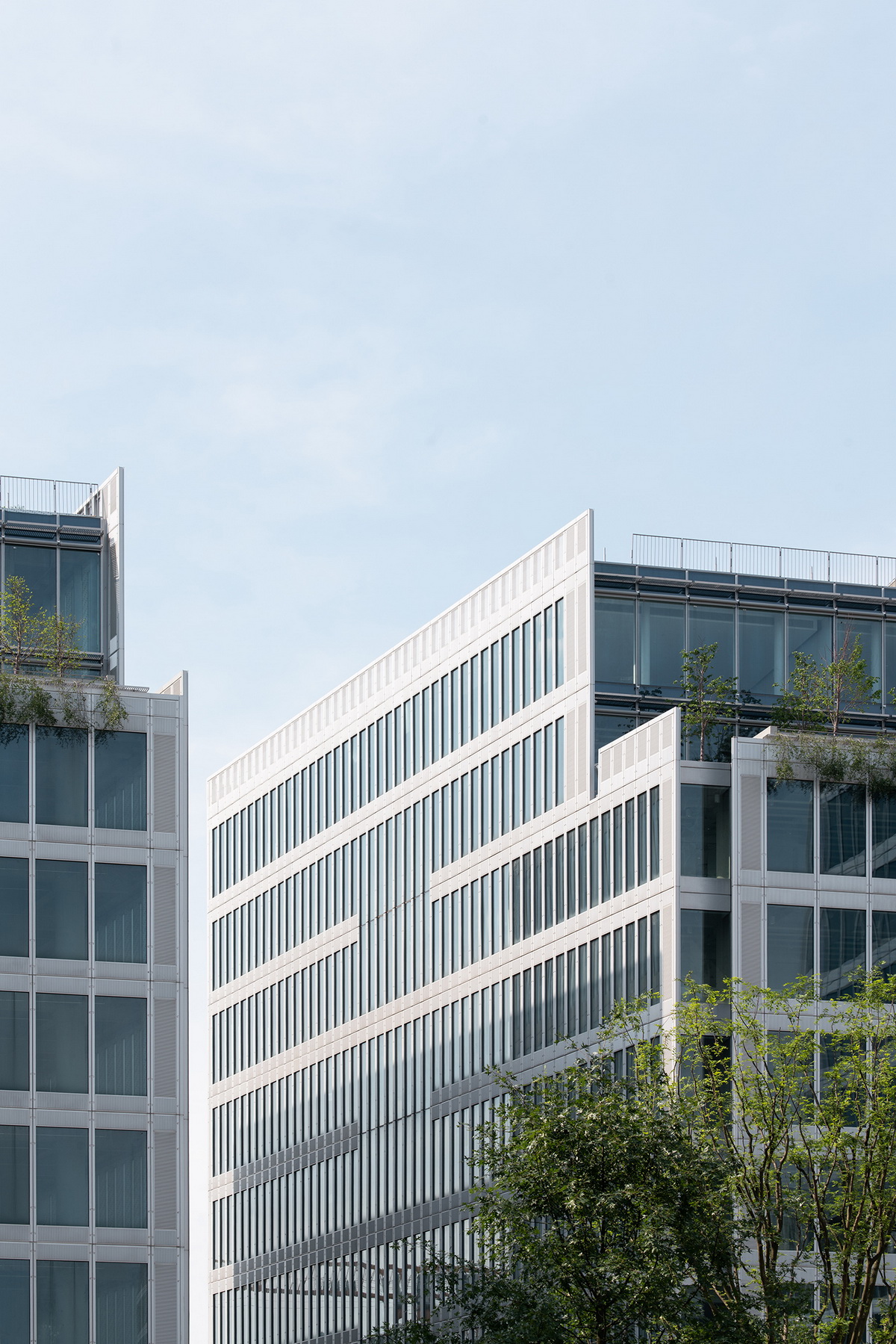 天目里的绿色“内核”是一个三维的系统,自下而上在不同标高呈现为:下沉庭院、地面植被、镜面水池、露台外挂花箱、屋顶茶园。全区的植物景观由美国植物生态专家Paul Kephart设计,绿色景观从地下自然延伸到地面,并沿着建筑立面向上攀升,直至屋顶。屋顶作为第五立面,种满了杭州的标志性树种——绿茶。运营团队为茶园精选了龙井43号和安吉白茶两个品种,它们适应性强,经得起自然与城市的挑剔。为了扩大屋顶种植面积,需要精心组织凸出屋面的核心筒和机电设备,还涉及滴灌、喷水、照明、遮阳、防风等系统性技术问题。天目里采用了丰富的绿色技术,现正在申请LEED BD+C:CS金级认证。