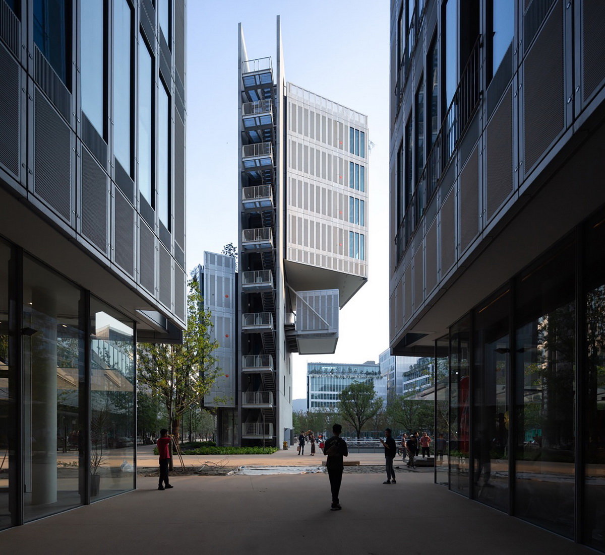 在路径的设置上,建筑师设计了四处转换梯(共8 部)分布于庭院中,地下车库必须先到达地面经过庭院,才能进入各办公楼。当玻璃轿厢缓缓升出地面,人们开始感受到中央广场的生态环境,这是整座园区的核心。每年,天目里会邀请不同的艺术家在转换梯轿厢中置入一件声音艺术作品,随着季节或人流量而变化。