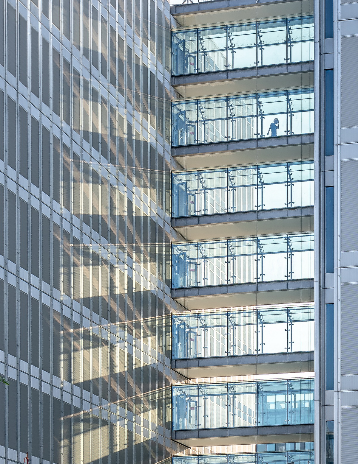 外立面大面积选用预制单元式幕墙系统(除首层、下沉庭院及退台之外的区域),幕墙总面积约8万平方米,以片状进口阳极氧化铝板材为主要材料。各单元板块均先在工厂预制拼装、工地现场吊装挂接,美观、高效、环保。工艺采用片状阳极氧化铝板表面压型处理,是国内大面积采用该种技术的第一个项目。