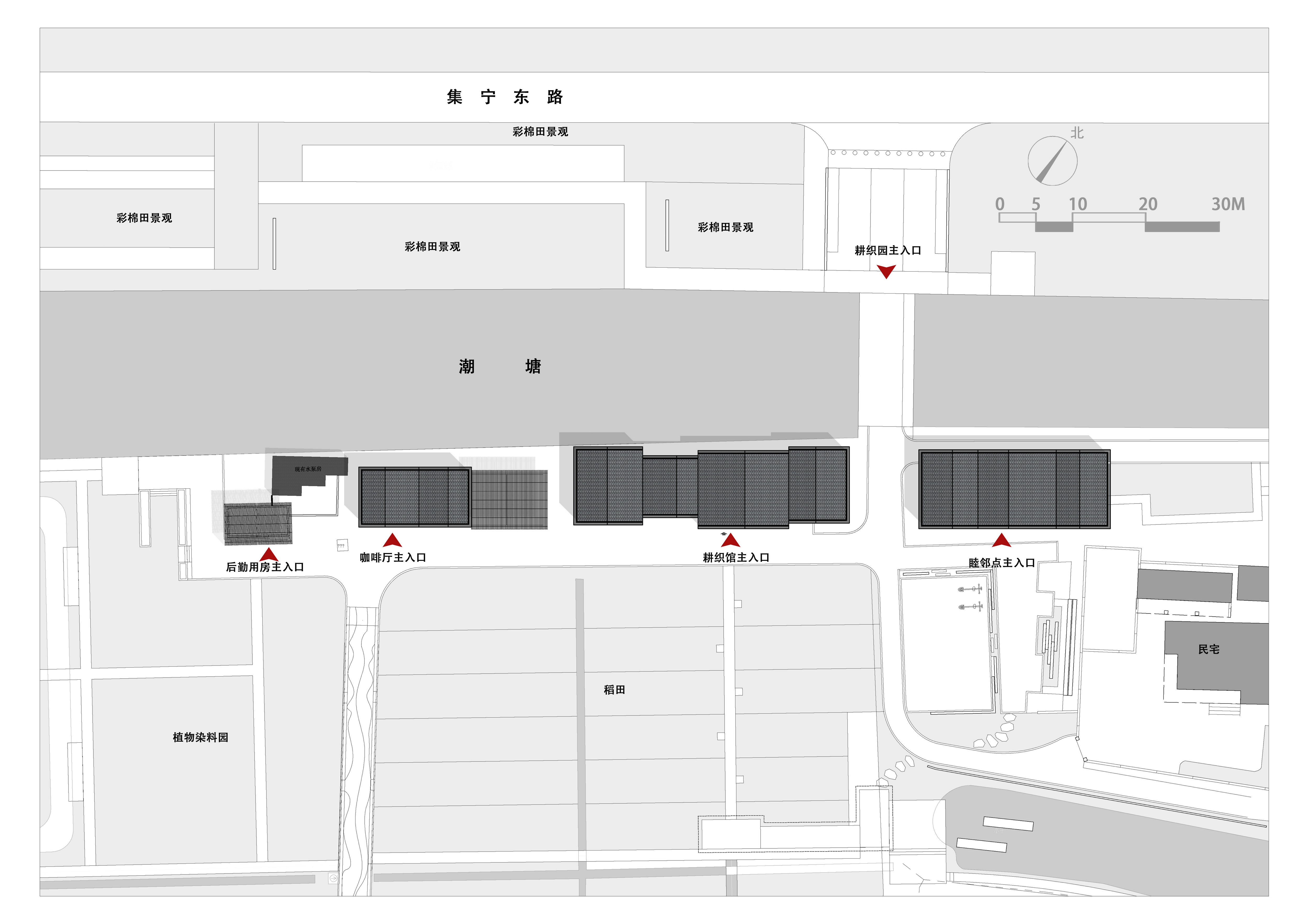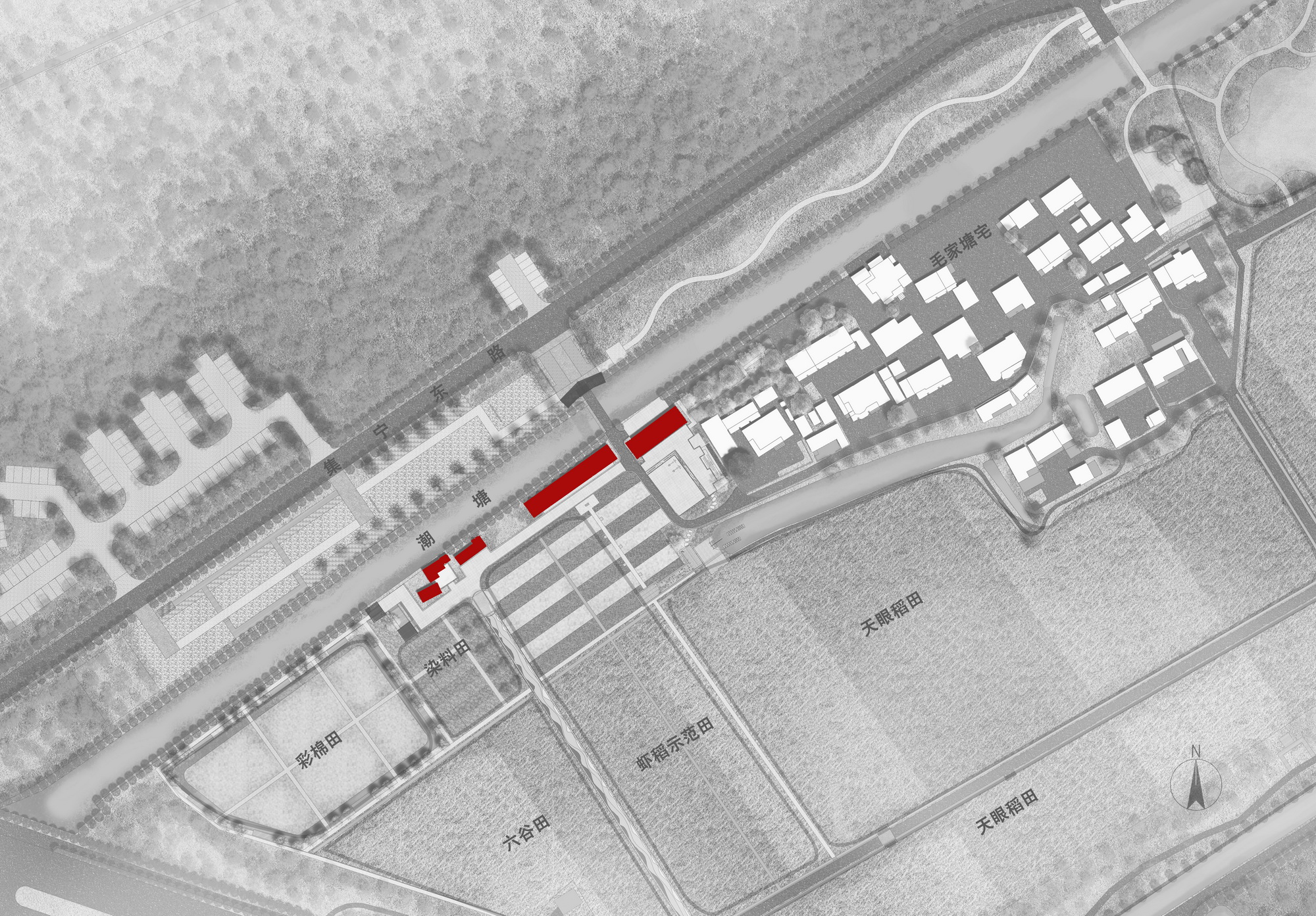 耕织馆位于花红村北部,处于广袤的粮田间,南向和西向为大片粮田,北向一侧紧邻河道,东接毛家塘宅。总体共有四处建筑改造项目:耕织馆、睦邻点、咖啡厅和后勤用房。改造后的建筑与独特的场地元素结合,带来独特的观景视角,站在稻田一侧望向场地,稻田、河道、建筑组成了一幅极具美感的画面,展现浓郁的乡野风貌。