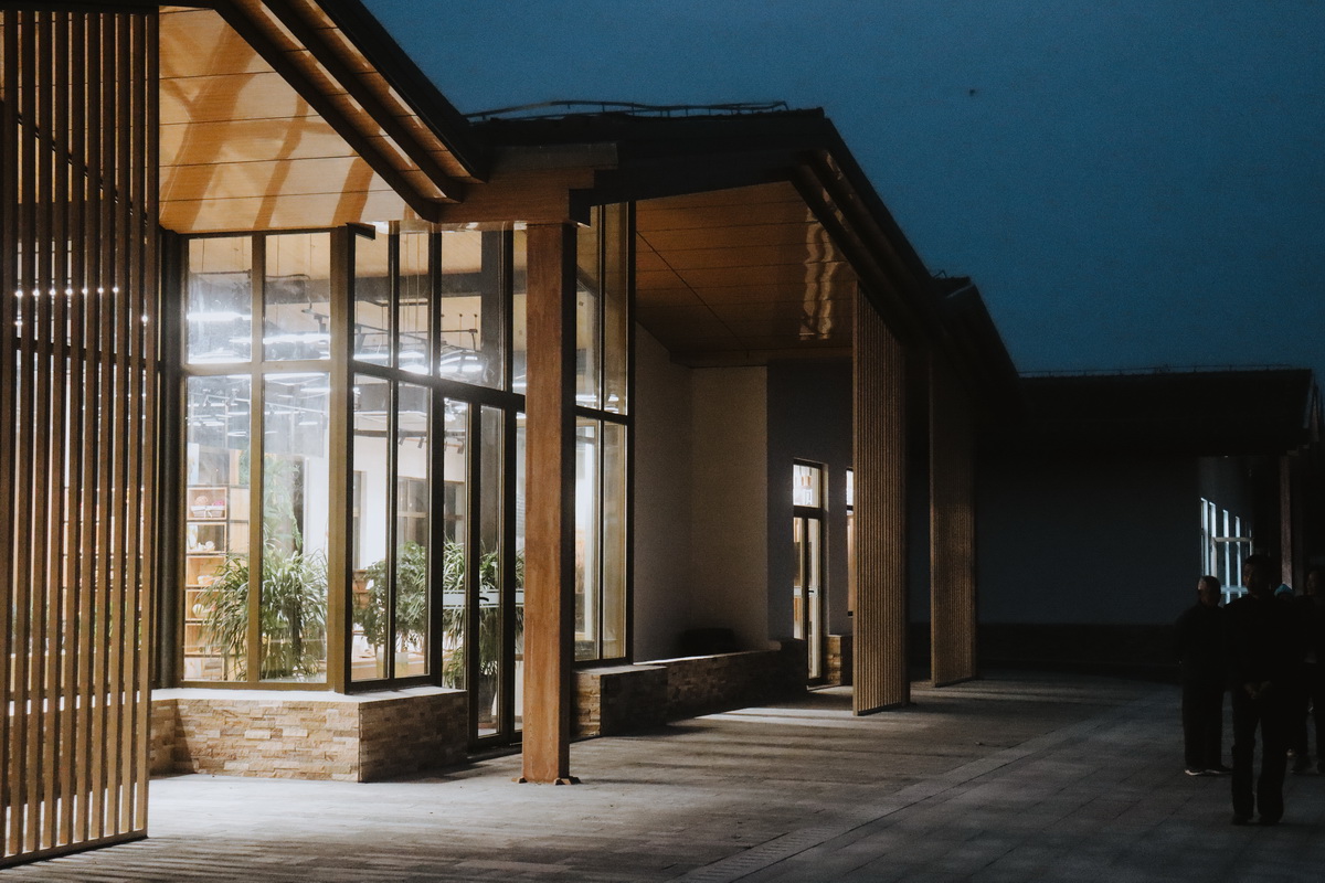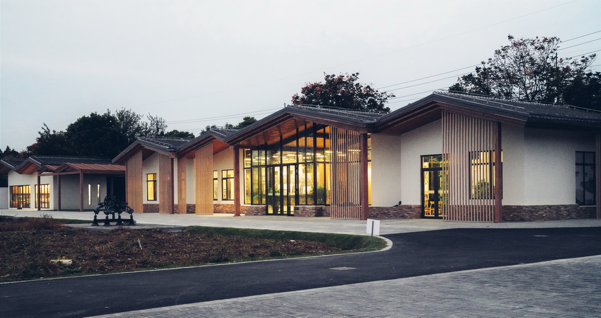 建筑通过连绵的大屋檐及连续的廊柱空间对人文元素进行回应,墙体隐在大屋檐下,给予一种古朴的视觉感受。作为乡野文化公建性质的建筑,坡屋顶就像是乡村聚落的一种符号,同时也是对原有建筑元素的延续。